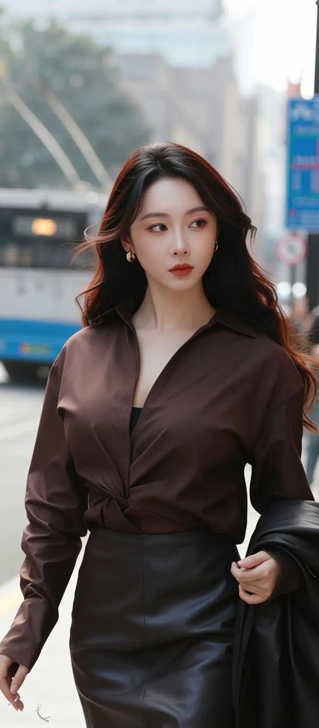 都市时尚风,棕色毛衣+黑色紧身裤,搭配高跟鞋,完美都市女性穿搭!