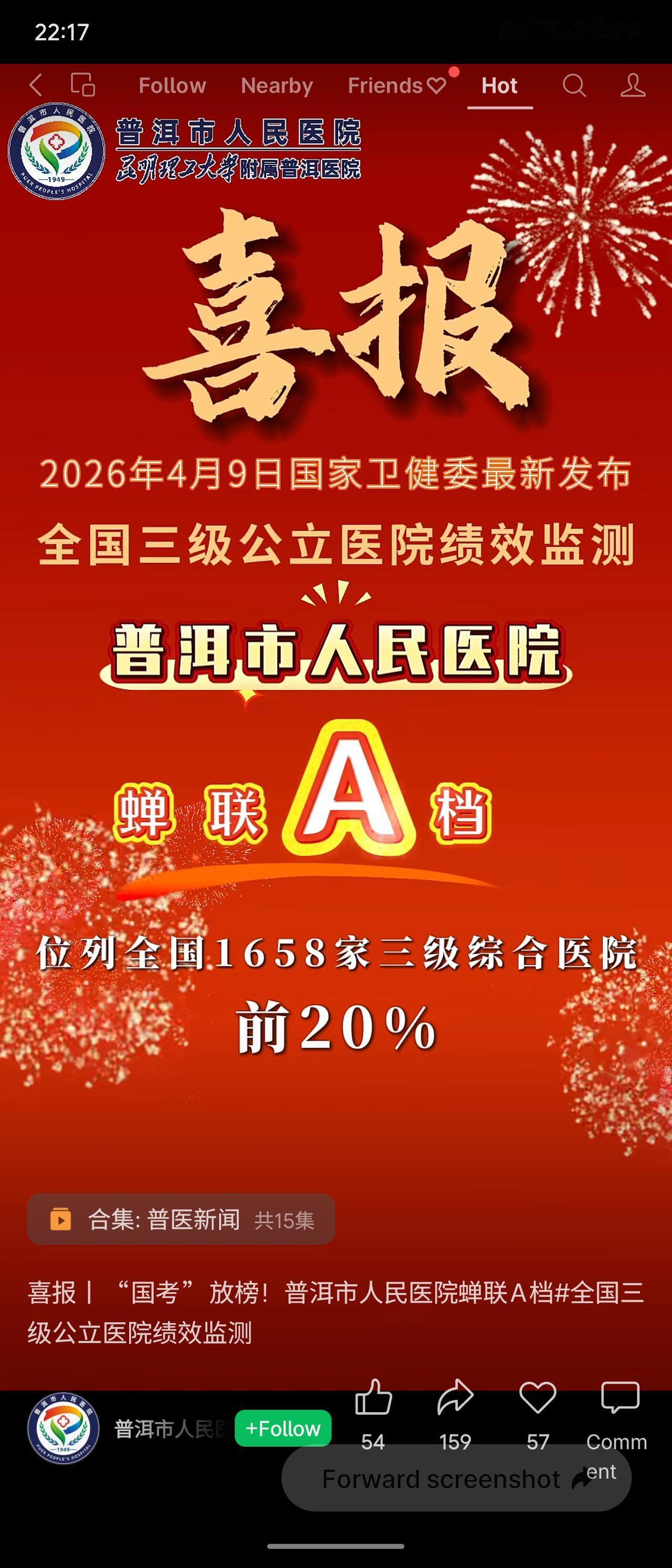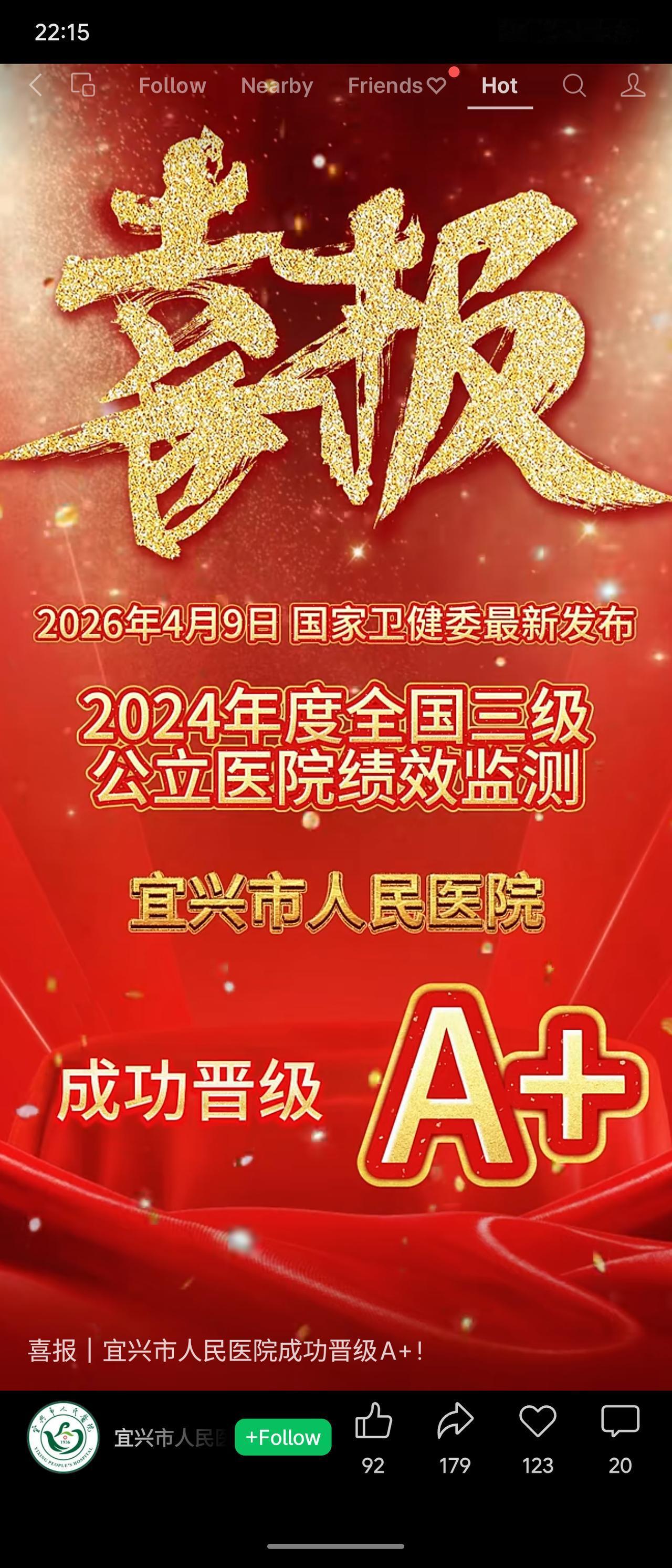 2024年度全国三级公立医院绩效监测(俗称“国考”)结果陆续公布:郴州市第一人民医院、常德市第一人民医院、宜兴市人民医院均获A+等级,稳居全国前10%;普洱市人民医院获A档,位列前20%。其中宜兴市人民医院为成功晋级,常德市第一人民医院为全省四家A+之一。分析:“国考”是衡量医院综合实力的权威标尺,多家中西部及地市级医院获得A+或A,反映出我国三级医院整体质量提升,但头部A+仍集中于少数医院,竞争激烈。