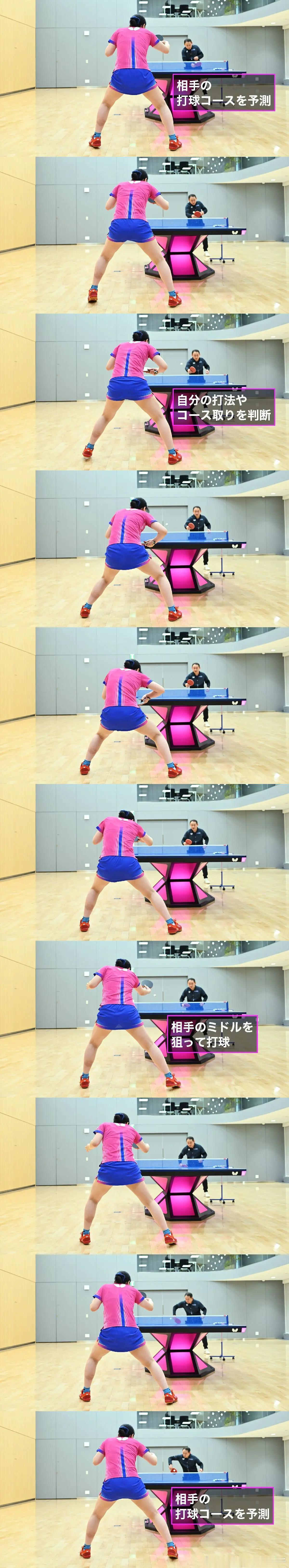 【蝴蝶】日本顶级训练 张本美和 第2篇:一举两得!同步强化正反手衔接转换与中路进攻!本栏目《日本顶级训练》聚焦日本国内顶尖队伍与选手的训练内容。本次登场的是2026年全日本乒乓球锦标赛史上首位斩获四冠(青年组女单、成年女单、混双、女双冠军)的张本美和(归属木下集团)。年仅17岁便成就四冠伟业,张本美和亲自讲解支撑自身佳绩的训练内容,解说训练目的与技术要点。胜利离不开日常训练。一起来从这份铸就前所未有纪录的训练方法中,收获变强的诀窍。*本篇技术讲解均以右手选手为示范标准。反手半台 对接 全台衔接转换训练针对对手送来的全台长球,反复练习:从自身反手区域,用正手弧圈或反手弧圈,击球落点控制在对手**中路(中线附近)**区间。训练目的与要点同时强化左右手衔接转换、中路落点控制能力时刻预判来球、快速判断,伺机瞄准中路进攻本次介绍的训练模式:对手全台范围送球,自身持续用正反手弧圈,将球回击至对方反手半台区域反复练习。由于无法预判对手来球落点,提前预判尤为关键。不同训练搭档的球质、落点分配各不相同,因此无论和谁对练,我都会坚持时刻预判对方回球线路。实战难免遭遇预判失误,纠结犹豫时,我会默认预判球去往反手位、以反手姿态等待。原因在于:反手转正手容易,正手转反手难度更高。抓住机会瞄准对手中路(右手选手右侧腰位)进攻,也是这项训练的核心要点。中路球属于正反手处理容易纠结的落点,能否针对性攻击中路,是当今乒乓球取胜不可或缺的能力。此前我只练习“对手反手半台、我方全台衔接”,如今为学会穿透进攻对手中路,特意将回球落点范围,扩大至包含中路在内的对手反手半台区域。训练中,自己同样会被对手针对中路落点牵制。中路是所有人都难受的落点,我自身也仍在补强这项能力,处理中路球判断最为关键。不能单纯依仗反手强项、全部用反手接中路球;要根据来球长短、落点临场区分,灵活切换正反手处理。同时我认为,中路落点兼具两面属性:既是进攻得分的优质线路,也是自身被动难受的回球点;且从中路回击的球,线路隐蔽性强、对手难以预判。若能高质量处理中路来球,就能把握住得分机会。因此这项训练中,我着重锻炼快速判断能力、打磨中路处理技术。下期内容,将继续介绍张本美和另一项训练,在锤炼正反手衔接的同时精进中路落点把控,敬请期待!