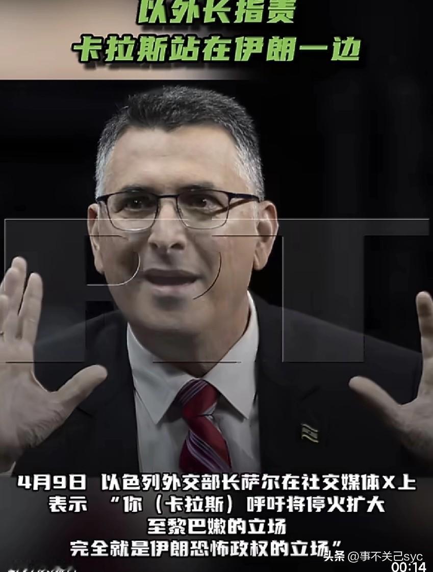 4月9日,以色列外交部长萨尔在社交媒体X上表示:“你(卡拉斯)呼吁将停火扩大至黎巴嫩的立场,完全就是伊朗恐怖政权的立场。”