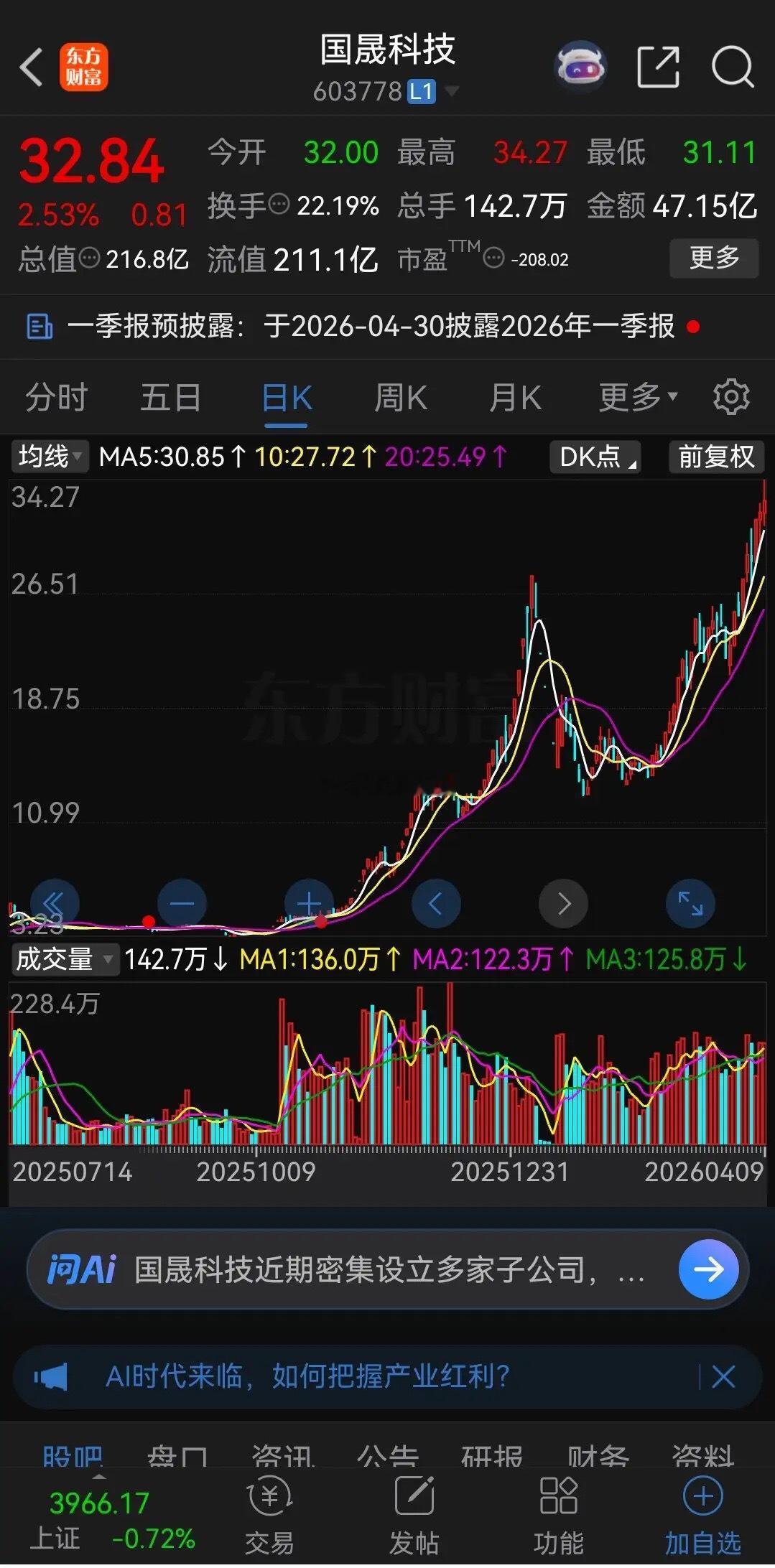 国晟科技,从2020年就开始亏损,连续亏损6年,累计亏损超过12亿元,而2025年年报归母净利润更是亏损3.25亿元至6.50亿元,同比下降207.98%至515.96%。就是这样一个亏得没眼看的公司,股价却从去年9月份的3.2元涨到了今天最高34.27元,半年时间股价暴涨了10倍还多。
