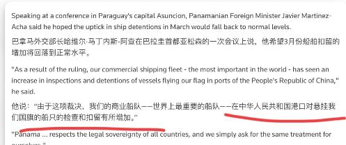 巴拿马外交部长马丁内斯阿查4月8日在巴拉圭喊了一嗓子,说中国对悬挂巴拿马国旗的船舶检查和扣押次数增加了,希望回落。他称巴拿马尊重所有国家的合法主权,只是要求同等待遇。