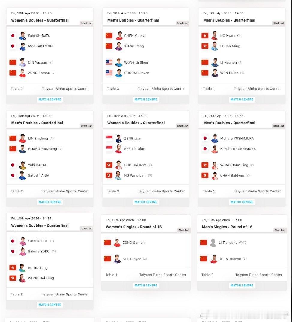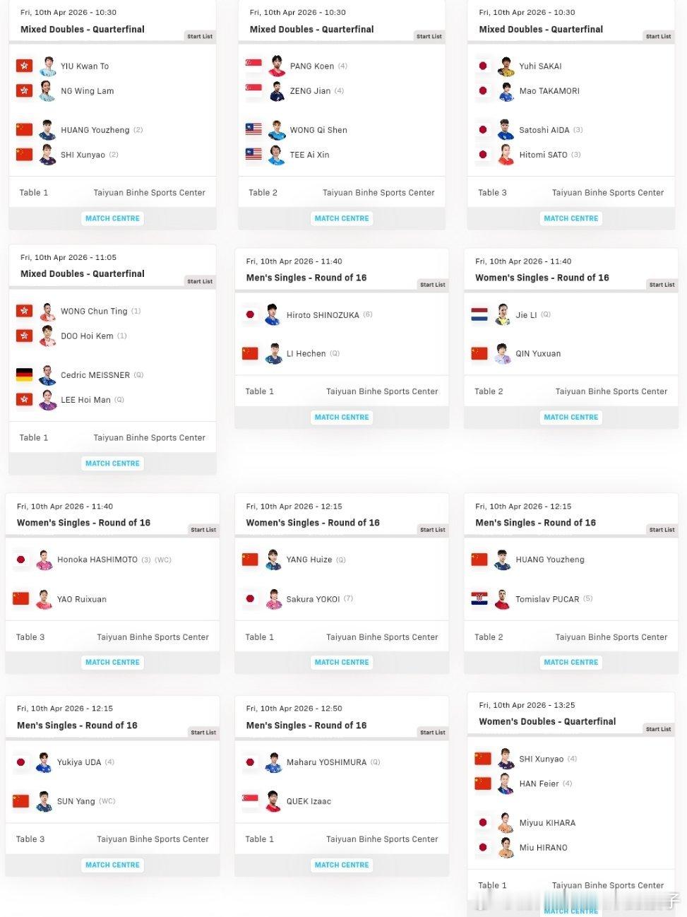 2026WTT太原常规挑战赛正赛第二比赛日赛程:4月10日10:30 混双 T1:黄友政石洵瑶🇨🇳VS姚钧涛吴咏琳🇭🇰11:40 男单 T1:李和宸🇨🇳VS篠塚大登🇯🇵11:40 女单 T2:覃予萱🇨🇳VS李洁🇳🇱11:40 女单 T3:姚睿轩🇨🇳VS桥本帆乃香🇯🇵12:15 女单 T1:杨蕙泽🇨🇳VS横井咲樱🇯🇵12:15 男单 T2:黄友政🇨🇳VS普卡🇭🇷12:15 男单 T3:孙杨🇨🇳VS宇田幸矢🇯🇵13:25 女双 T1:石洵瑶韩菲儿🇨🇳VS木原美悠平野美宇 🇯🇵13:25 女双 T2:覃予萱纵歌曼🇨🇳VS芝田沙季高森爱央 🇯🇵13:25 男双 T3:陈垣宇向鹏🇨🇳VS钟子毅黄祺燊🇲🇾14:00 男双 T1:温瑞博李和宸🇨🇳VS何钧杰李汉铭🇭🇰14:00 男双 T2:林诗栋黄友政🇨🇳VS英田理志坂井雄飞🇯🇵