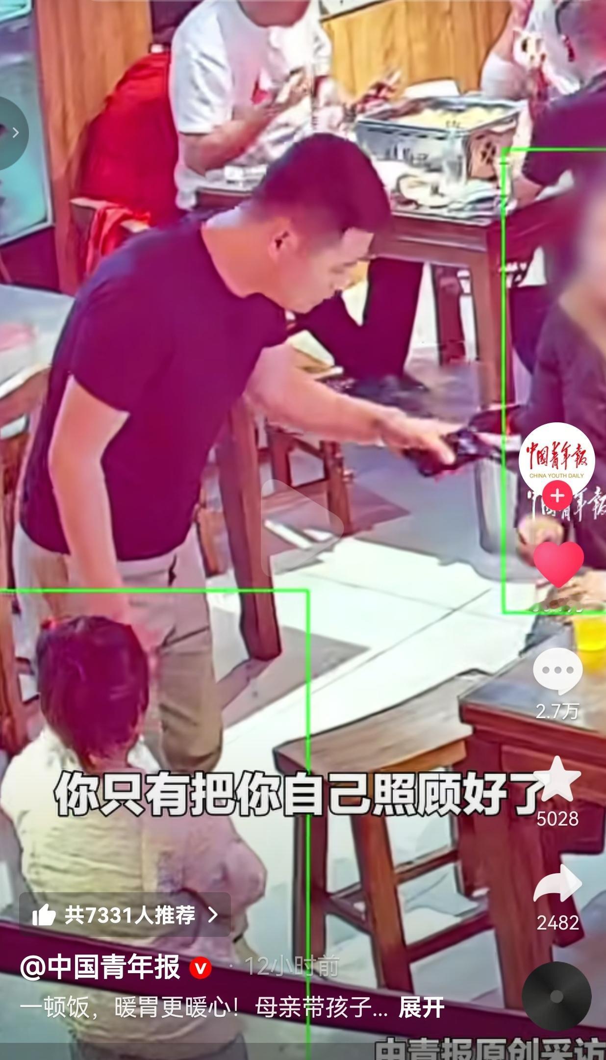 菜端上来的时候,更让人破防的一幕出现了:这位妈妈一口没有吃,全程都在小心翼翼地喂孩子,想把最好的都留给了孩子。