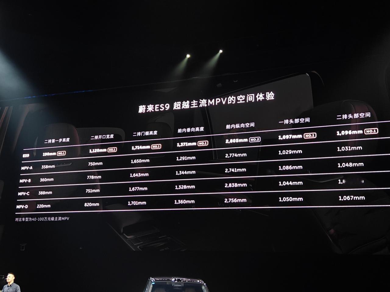 为什么蔚来(到目前为止)还不造MPV?发布会给了一个答案。 因为蔚来ES9足够大,车内空间既有复式的高,又有大平层的广,看图里各种参数都是第一,空间利用率高+便利性,可能这就是理由,它哪还需要造MPV。