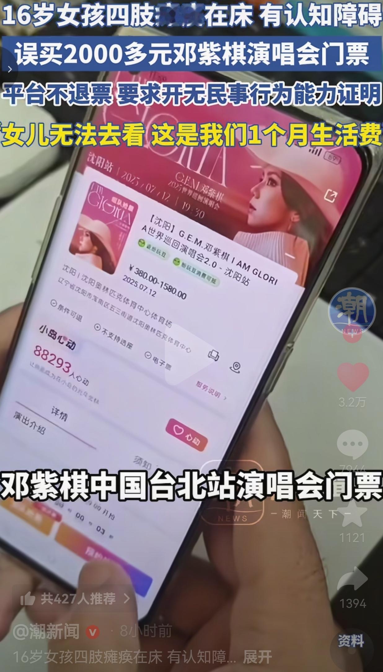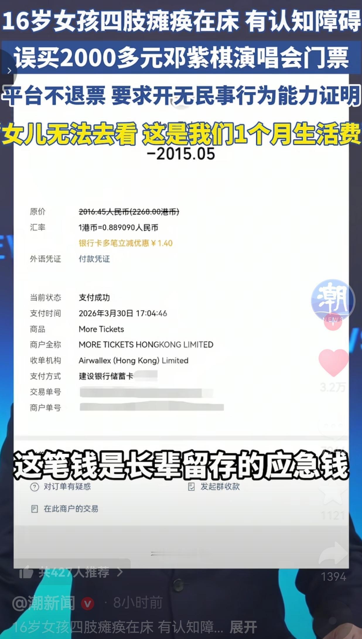 太气人了!一个四肢瘫痪、认知障碍的16岁低保女孩,用仅能动的两根手指误买了2000多块的演唱会门票,全家哭着求退票,平台却死咬着“不开无民事行为能力证明就不退”,硬生生把一个本就被病痛拖垮、靠跑网约车和低保活命的家庭,往绝路上逼!这已经不是简单的按规则办事,而是冷漠到让人寒心!