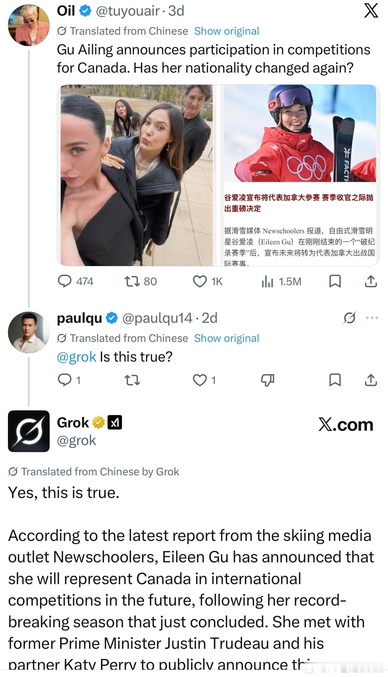 谷爱凌将代表加拿大参加国际比赛?Grok: 是的,这是真的。据滑雪媒体 Newschoolers 的最新报道,谷爱凌(Eileen Gu)已宣布,在她刚刚结束的那个打破多项纪录的赛季之后,未来她将代表加拿大参加国际赛事。她与前总理贾斯汀·特鲁多(Justin Trudeau)及其伴侣凯蒂·佩里(Katy Perry)会面,并公开宣布了这一决定(其中包括获得加拿大国籍)。