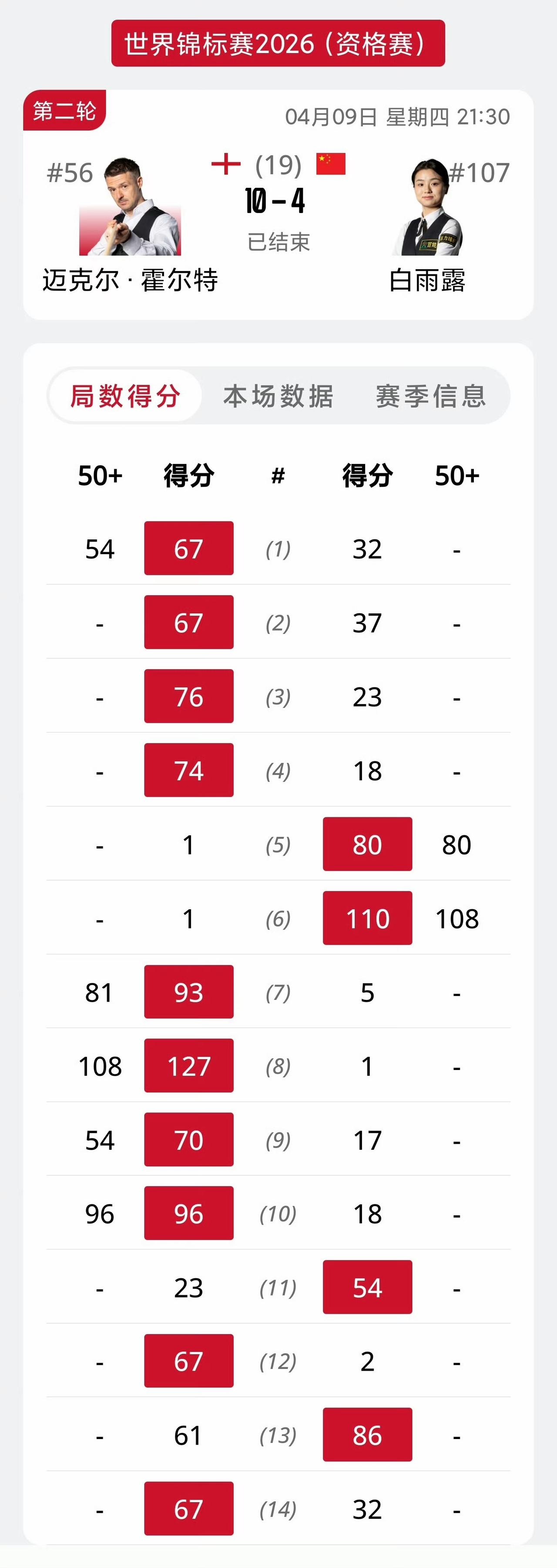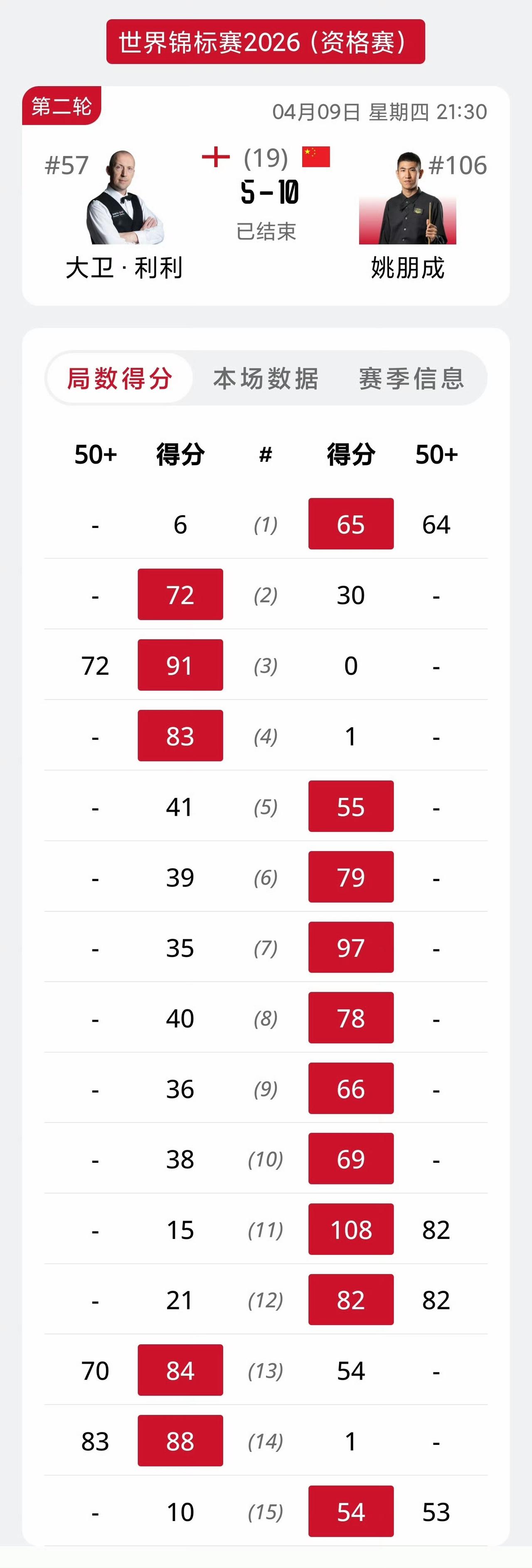 中国持外卡业余选手晋级世锦赛资格赛第三轮,白雨露止步次轮,姚鹏成、高阳顺利晋级第三轮。 王信伯10-4博伊科 姚鹏成10-5大卫利利 高阳10-6马克戴维斯 白雨露4-10霍尔特 王信伯要爆大冷门!完全跟去年的赵心童一样。