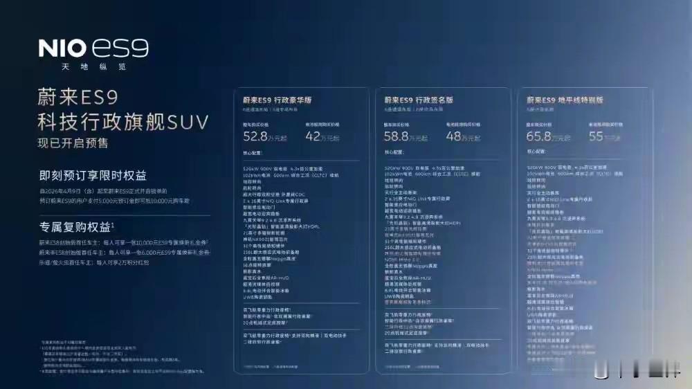 【蔚来ES9亮相:全尺寸旗舰SUV】4月9日晚,蔚来ES9正式亮相并开启预售,预计5月底上市,6月1日交付。车身尺寸5365×2029×1870mm,轴距3250mm,提供6/7座布局。搭载第三代纯电平台、5nm车规级智驾芯片,CLTC最高续航620km。
