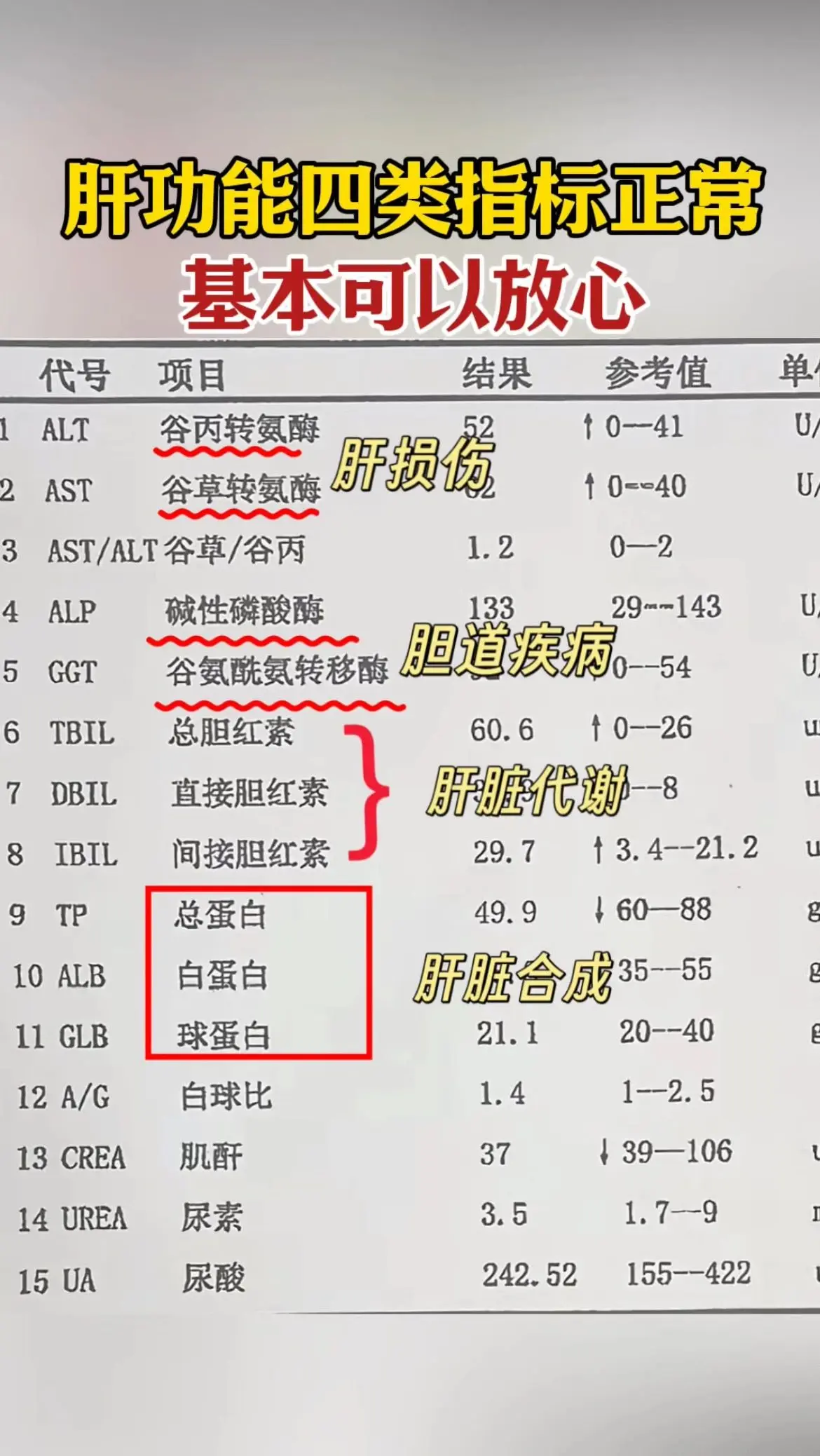 3、白蛋白:评估肝脏储备功能的核心指标。白蛋白降低可能增加腹水发生风险,但不是所有白蛋白升高都会出现腹水正常=营养都能被好好转化