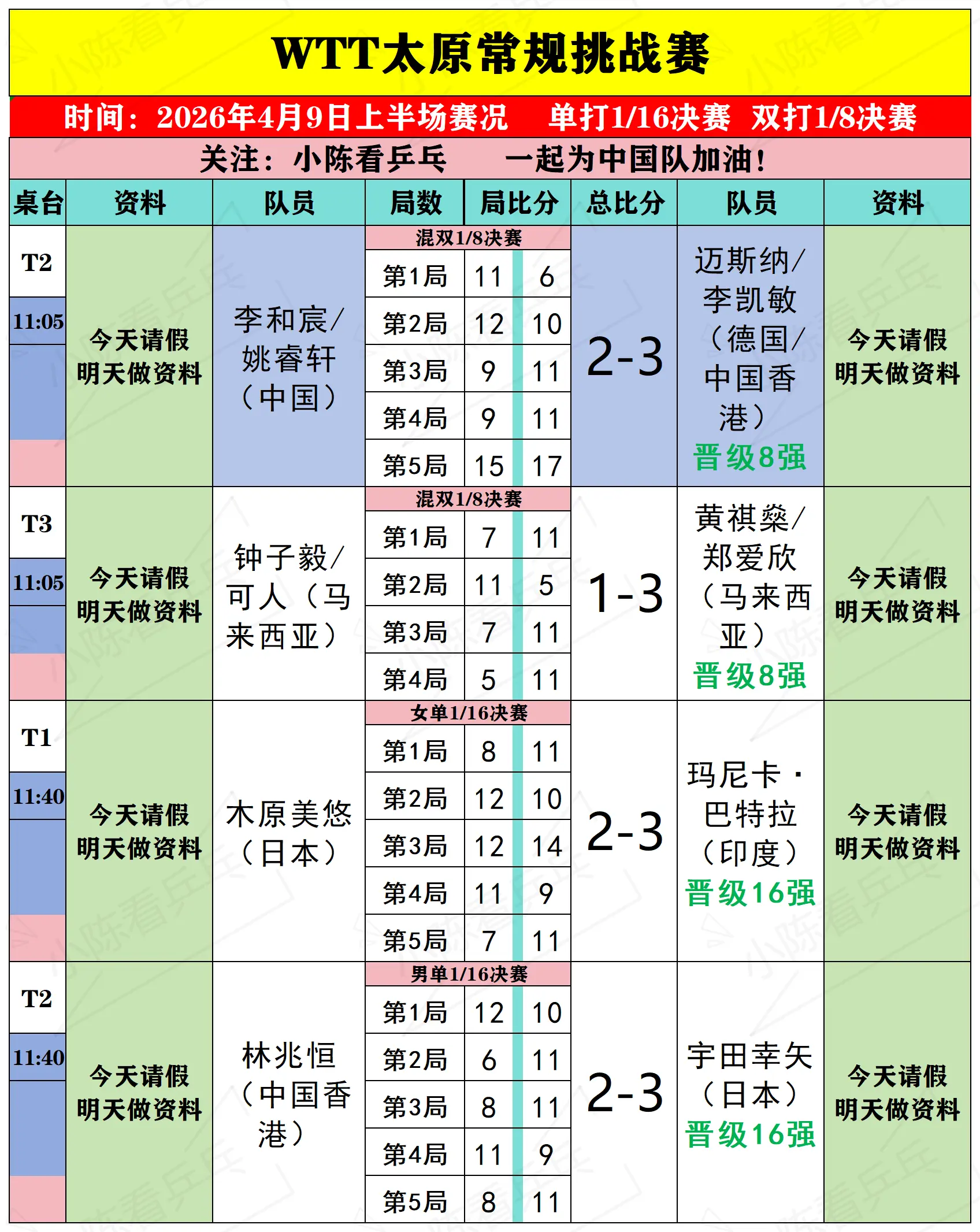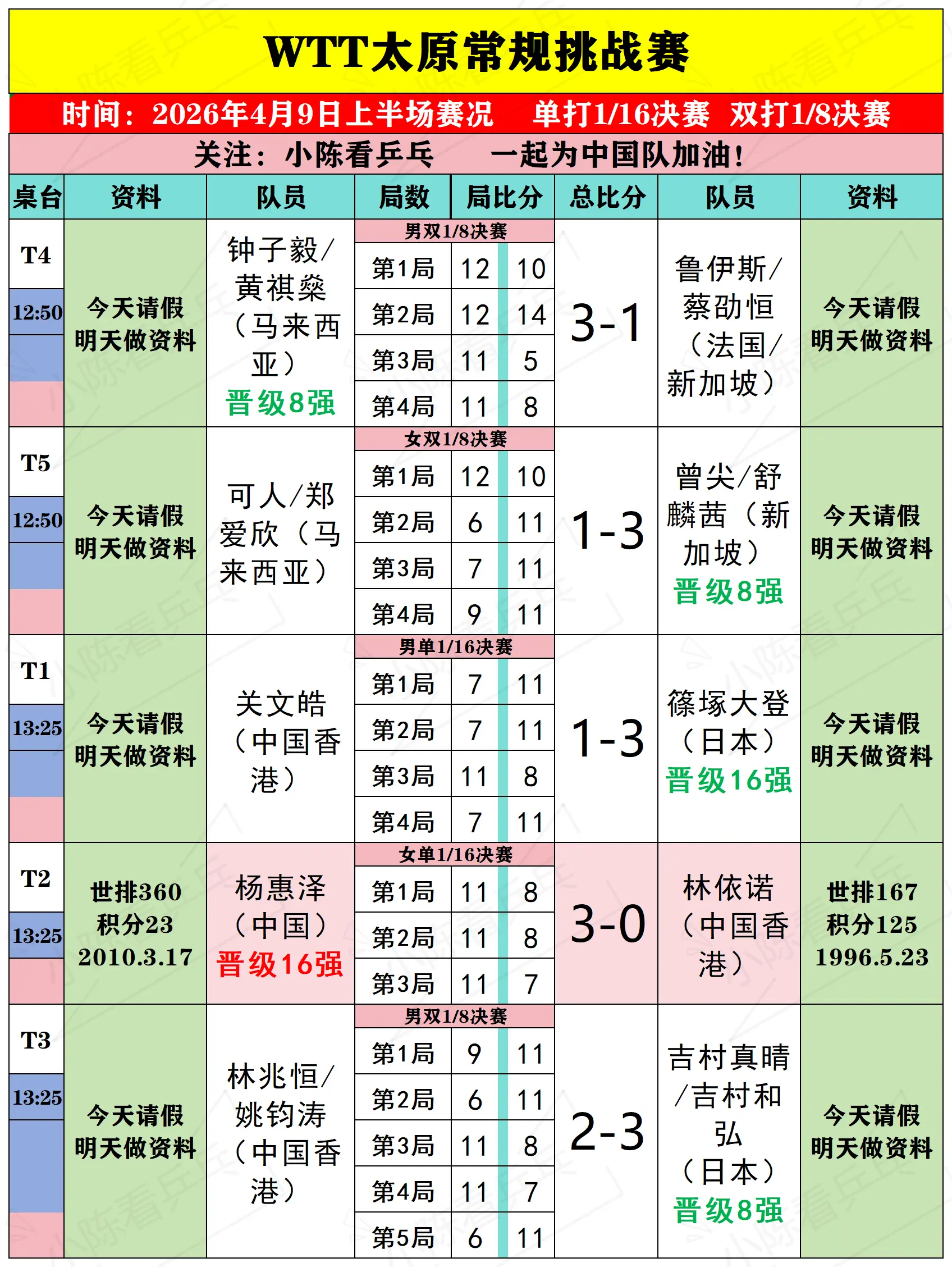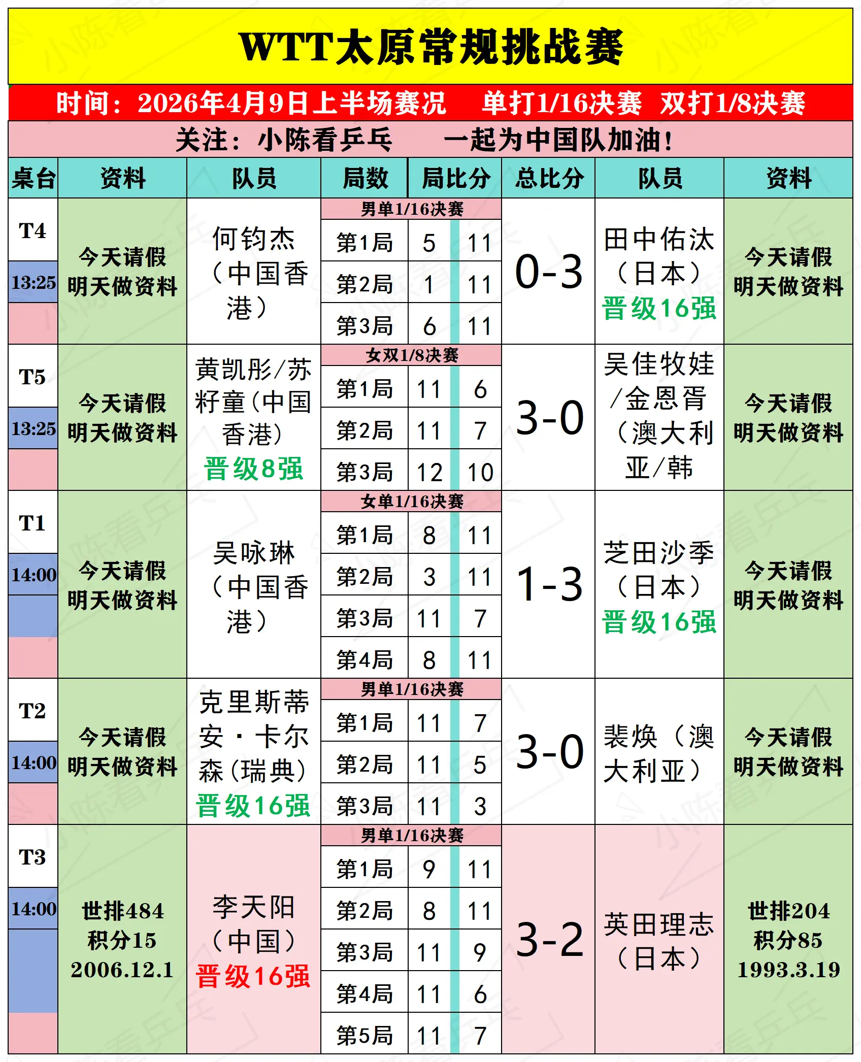WTT太原常规挑战赛4月9日上半场赛况。WTT太原常规挑战赛4月9日上半场比赛结果,男女单打1/16决赛,双打1/8决赛,中国队混双4对组合仅1对组合晋级8强,其他中国队场次全部取得胜利,中国队继续加油。