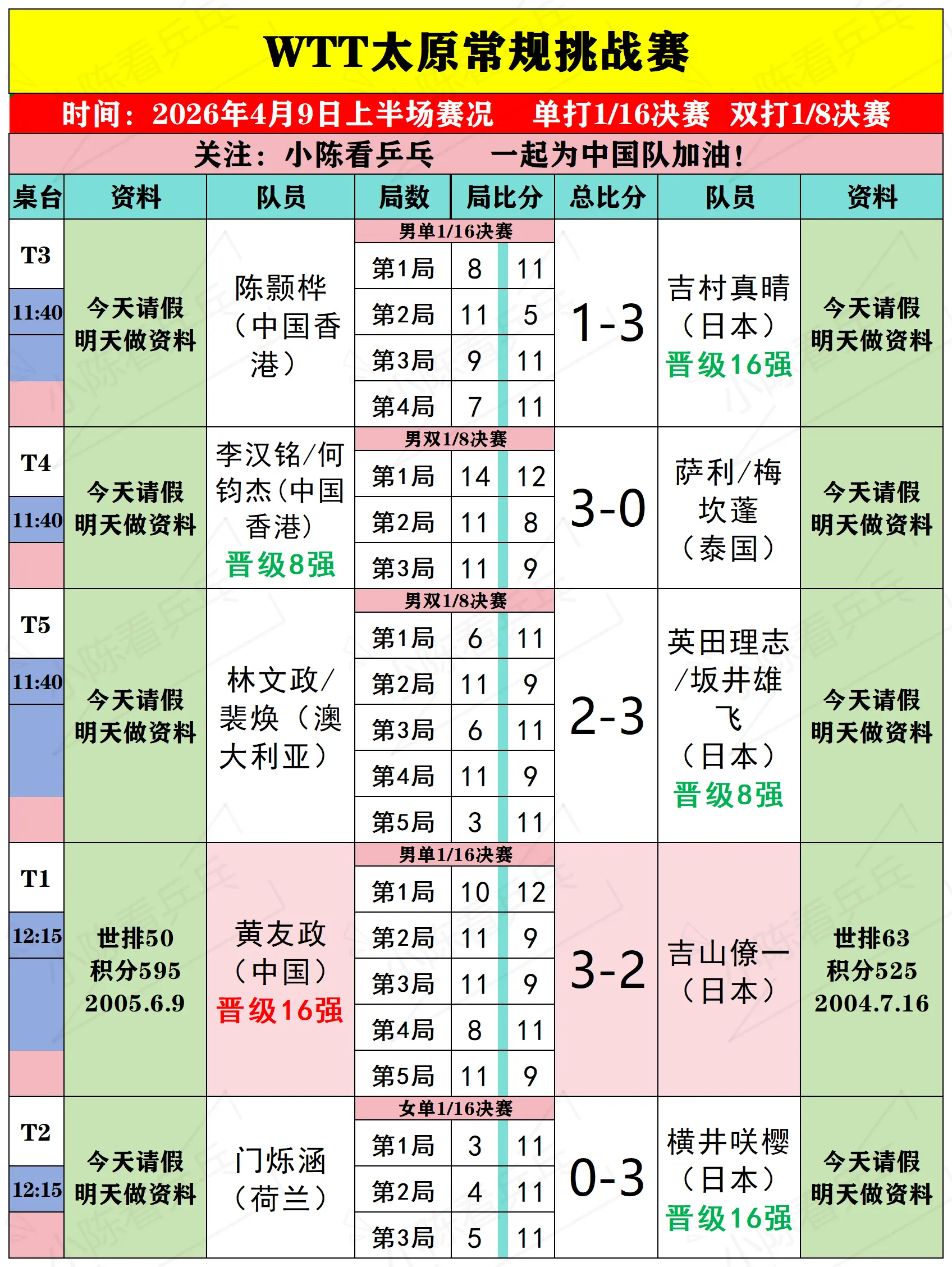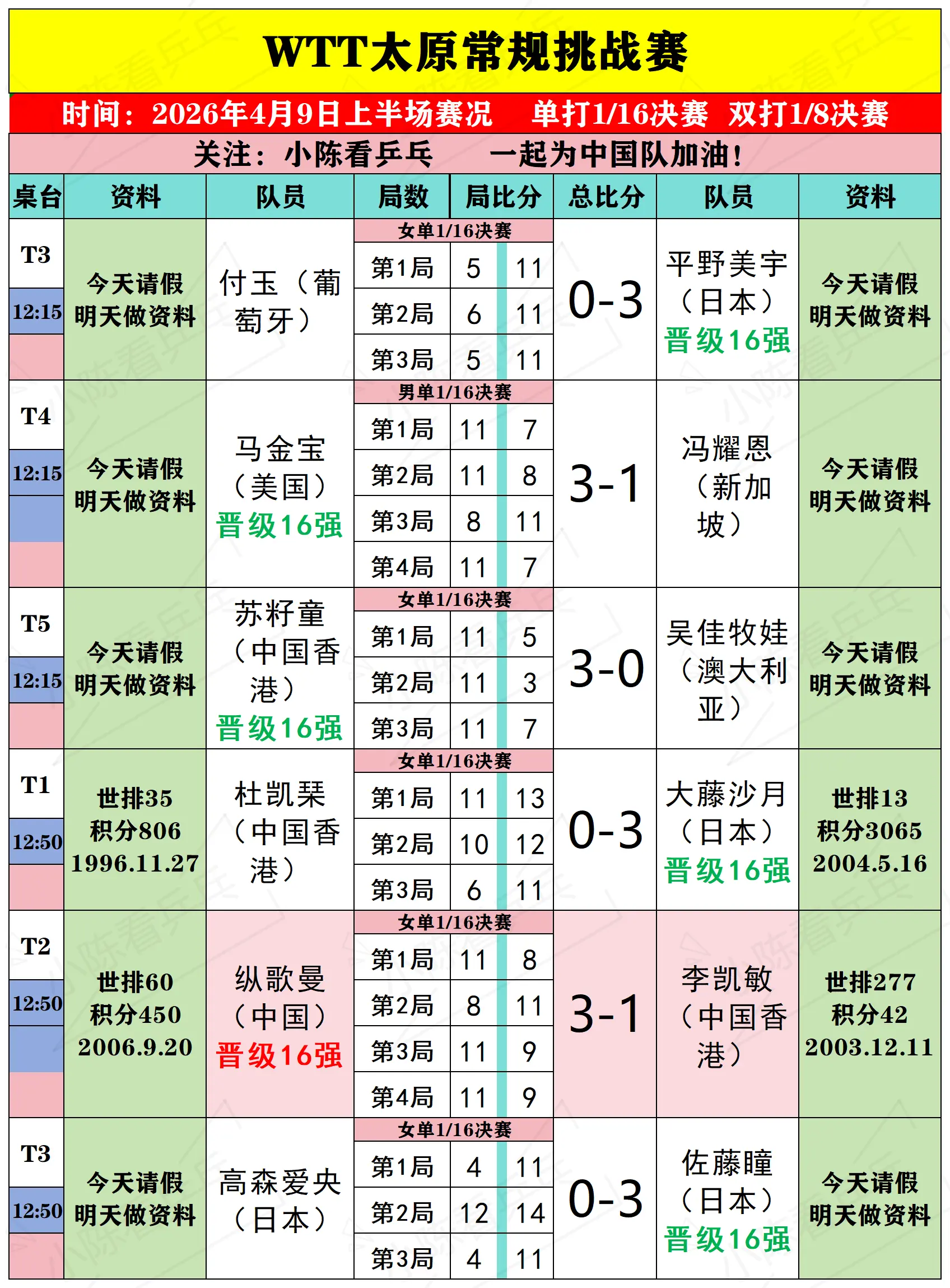 WTT太原常规挑战赛4月9日上半场赛况。WTT太原常规挑战赛4月9日上...