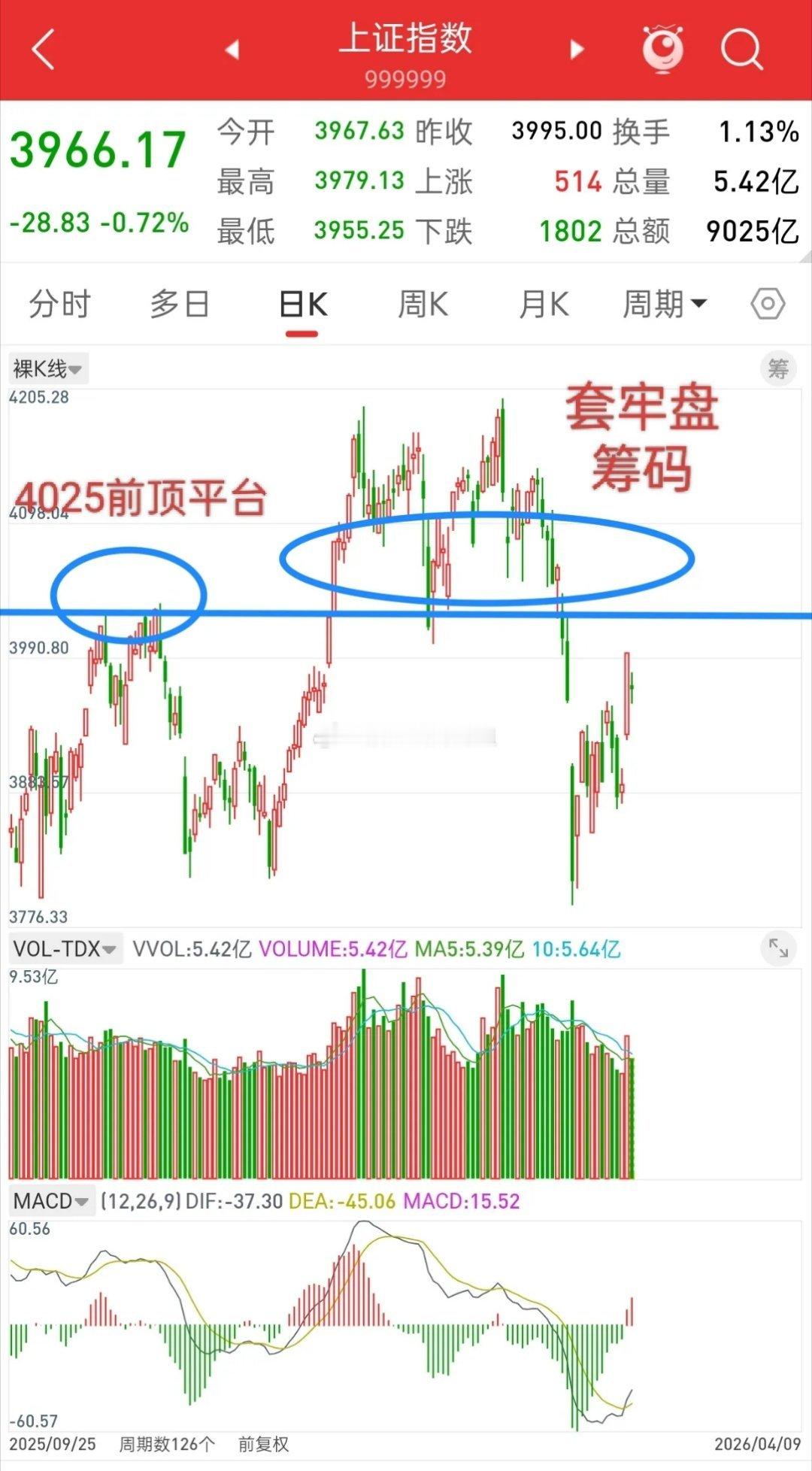 而往上看,只看到前顶4025附近,前顶以上都是套牢盘,因此前顶以上也不看多。