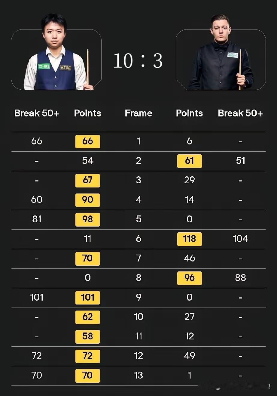 - 3杆破百(143分,本届资格赛单杆最高分)、4杆50+