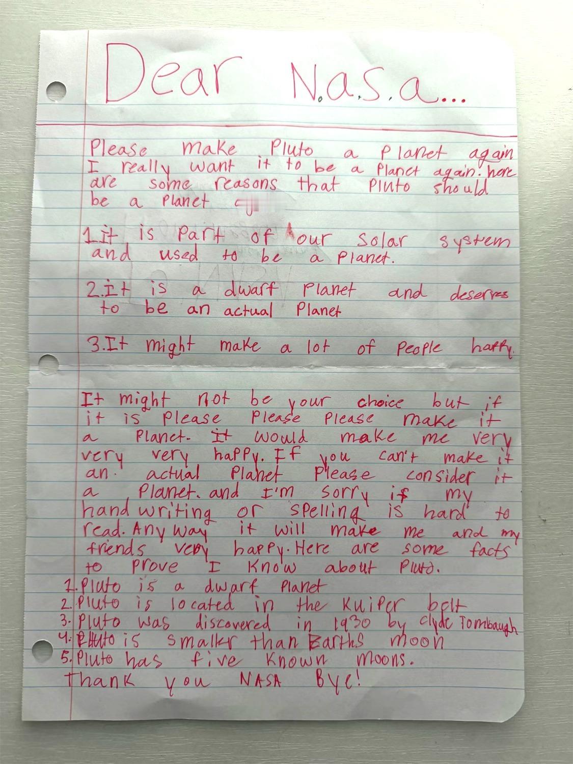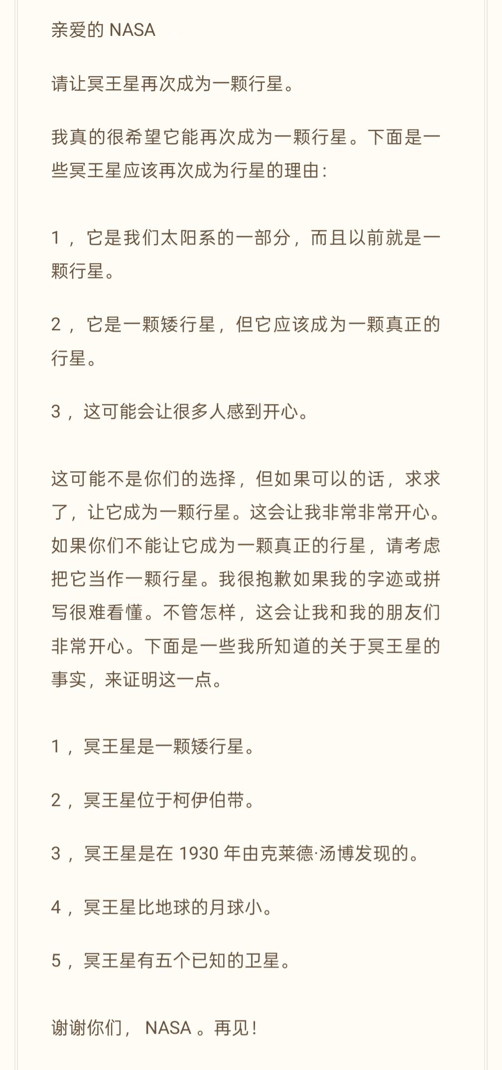 一位十岁的小朋友写信给NASA ,请求恢复冥王星的行星地位。