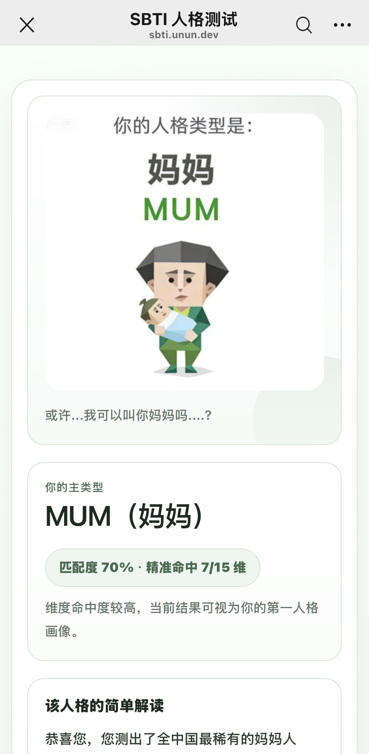 sbtiSBTI一整个刷屏了!!!测的过程很随意,结果五花八门,还挺有趣~很符合当下一部分人「一本正经胡说八道」的情绪,也有可能是「胡说八道的很正经」hhh~所以,真的有孤儿吗?MUM全收留bushi👀
