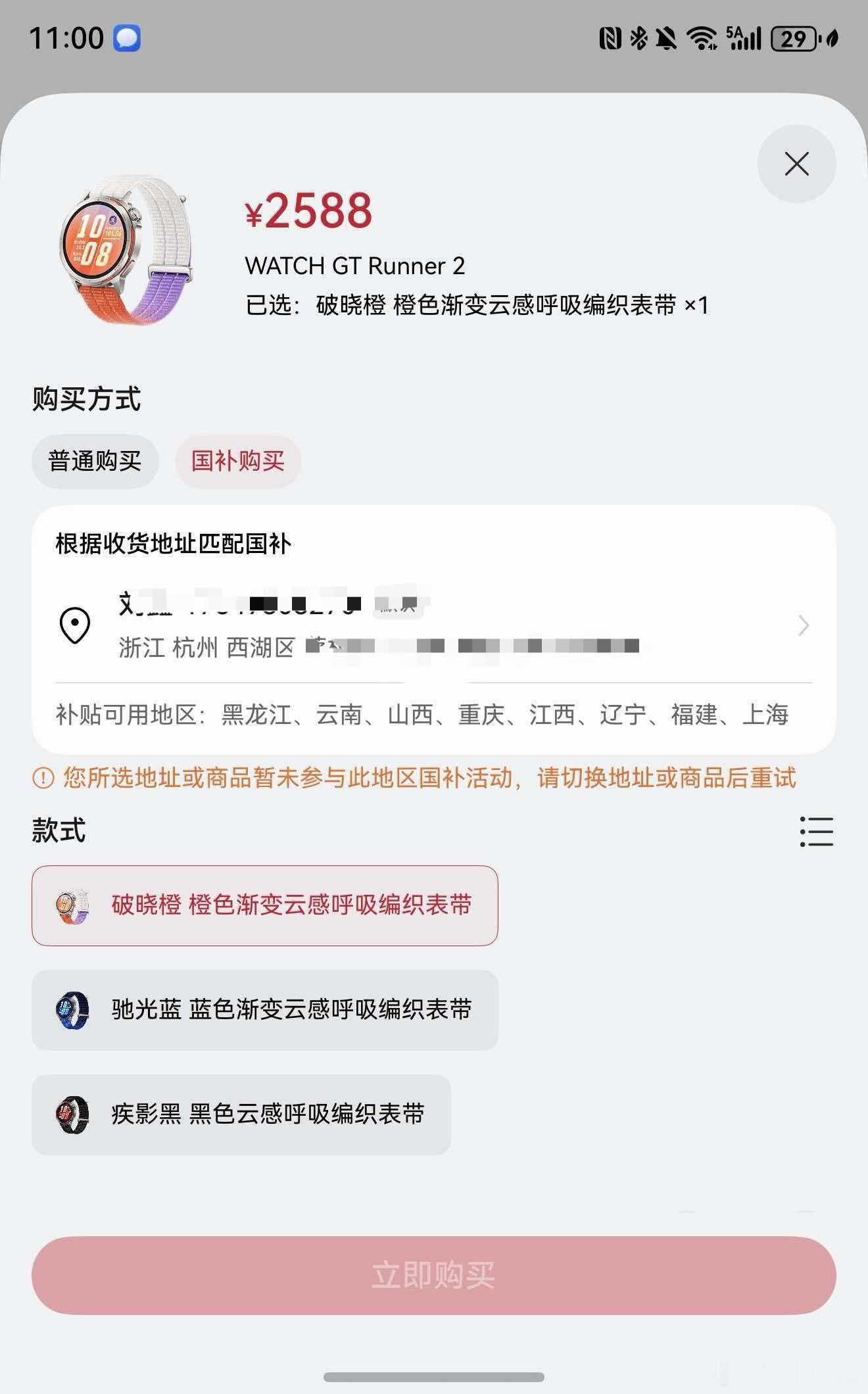 华为智能专业跑表Runner 2 今天开售,但不知道为啥华为商城浙江是没有国补的