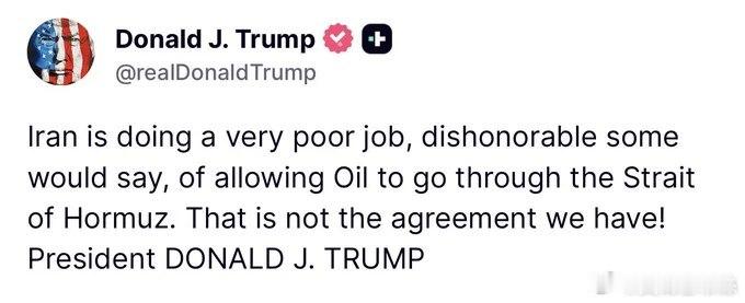 川普表示:伊朗在允許石油通過霍爾木茲海峽一事上表現極差,有人甚至稱之為不光彩。這與我們達成的協議完全不符!