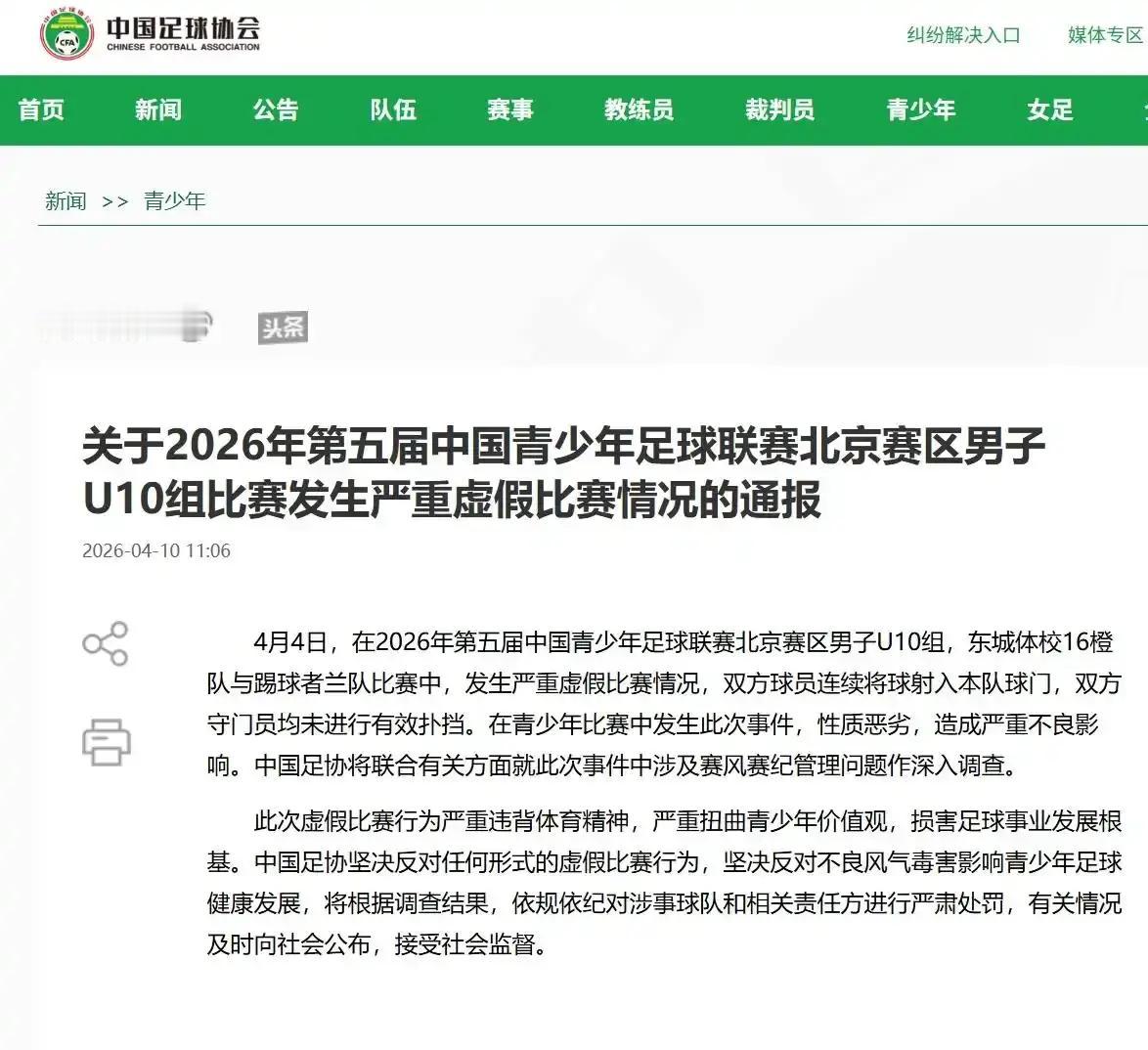 足球本该是教会孩子赢,而不是教会他们怎么算着输。这事儿得查到底,XX会、裁判、监督一个不能跑。别让孩子的足球梦,死在成人的算计里。清白点,就这么难吗?丑陋!中青赛U10组两队互射自家球门 中国足协介入调查