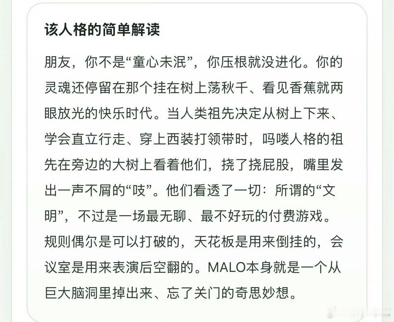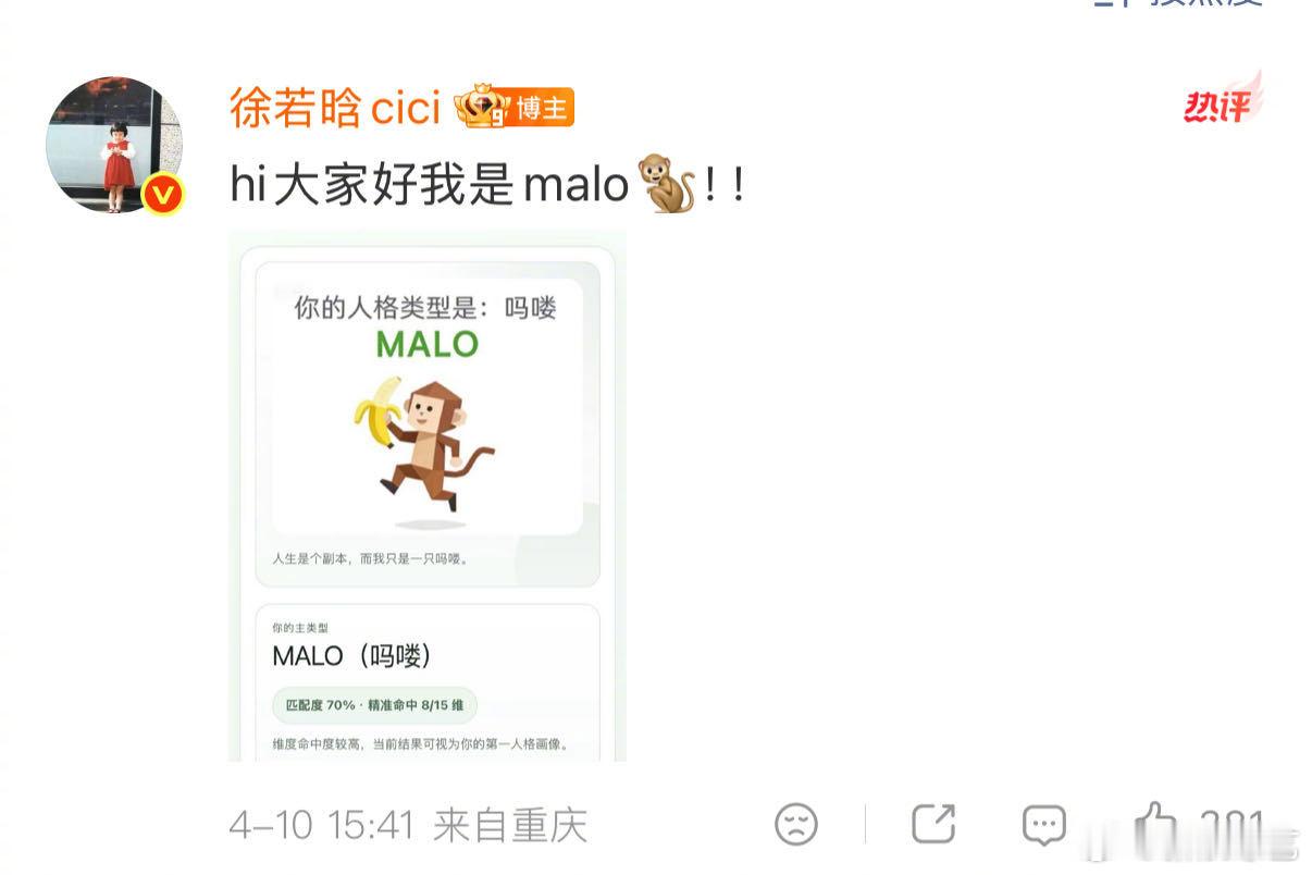 徐若晗的sbti是malo 确诊吗喽型人格!五十公里桃花坞 徐若晗分享桃花坞录制碎片,还在评论区说了自己测出的SBTI是malo!原来徐若晗是童心未泯的快乐小猴好奇心强又带点出其不意,完全是若晗妹妹本人啦(cr.logo)