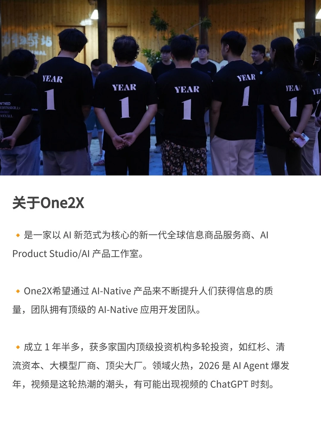 🔸One2X希望通过 AI-Native 产品来不断提升人们获得信息的质量,团队拥有顶级的 AI-Native 应用开发团队。