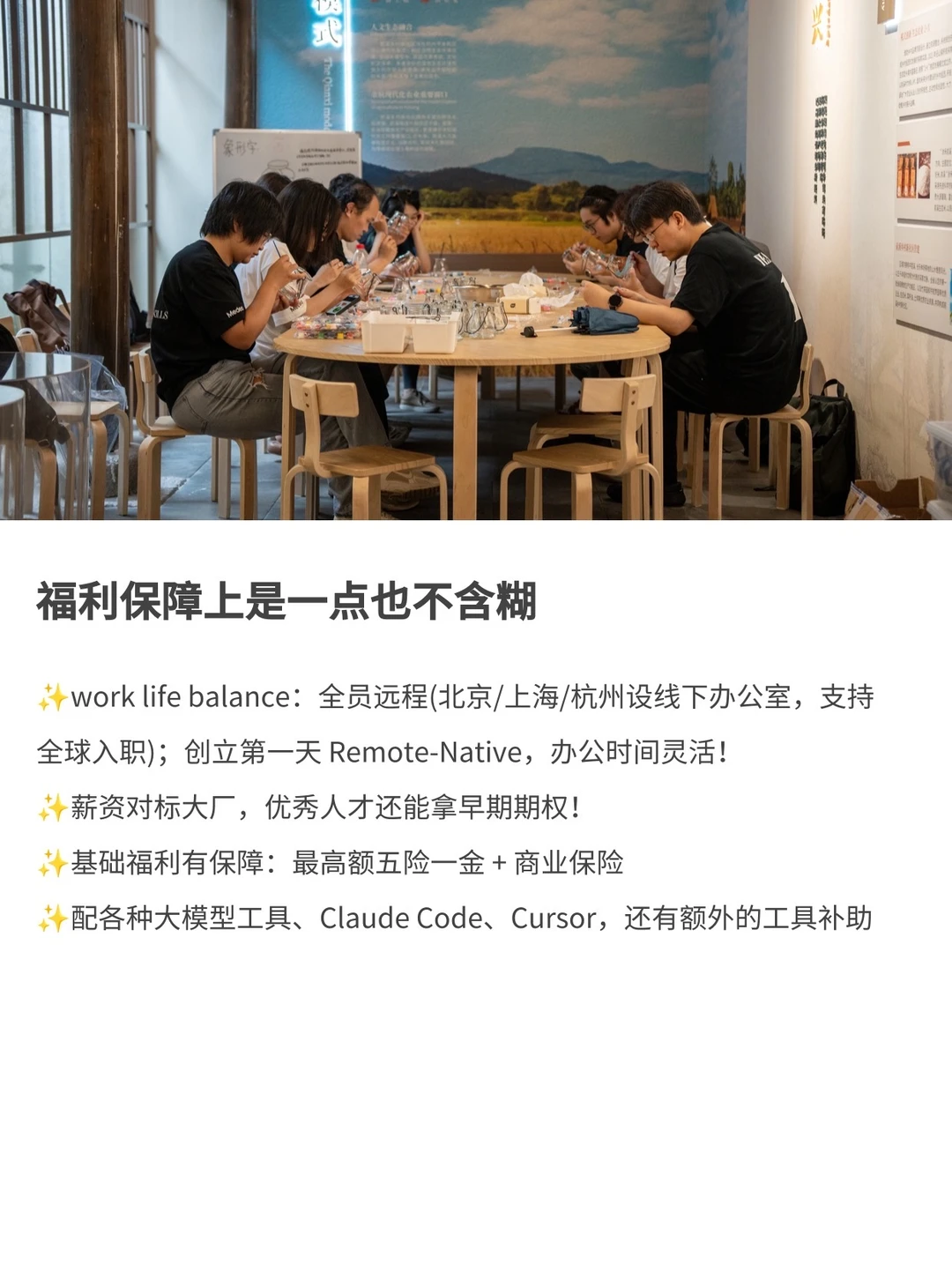 ✨work life balance:全员远程(北京/上海/杭州设线下办公室,支持全球入职);创立第一天 Remote-Native,办公时间灵活!