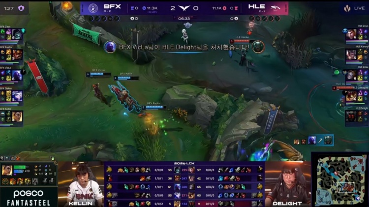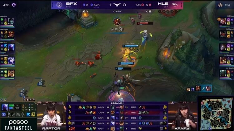 [3:50]BFX野辅来中打3v2,Kellin芮尔骑脸Kanavi赵信后Raptor皇子EQ二连将其挑飞一巴掌拍在Kanavi脸上拿到一血。