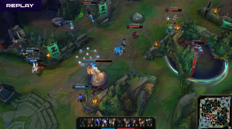 [17:36]HLE中路放出先锋推进,宙斯杰斯被Vicla瑞兹捆住一套击杀,Clear掘墓被换,双方打出1换1,HLE中路二塔施压,Delight派克开大斩掉Kellin芮尔。