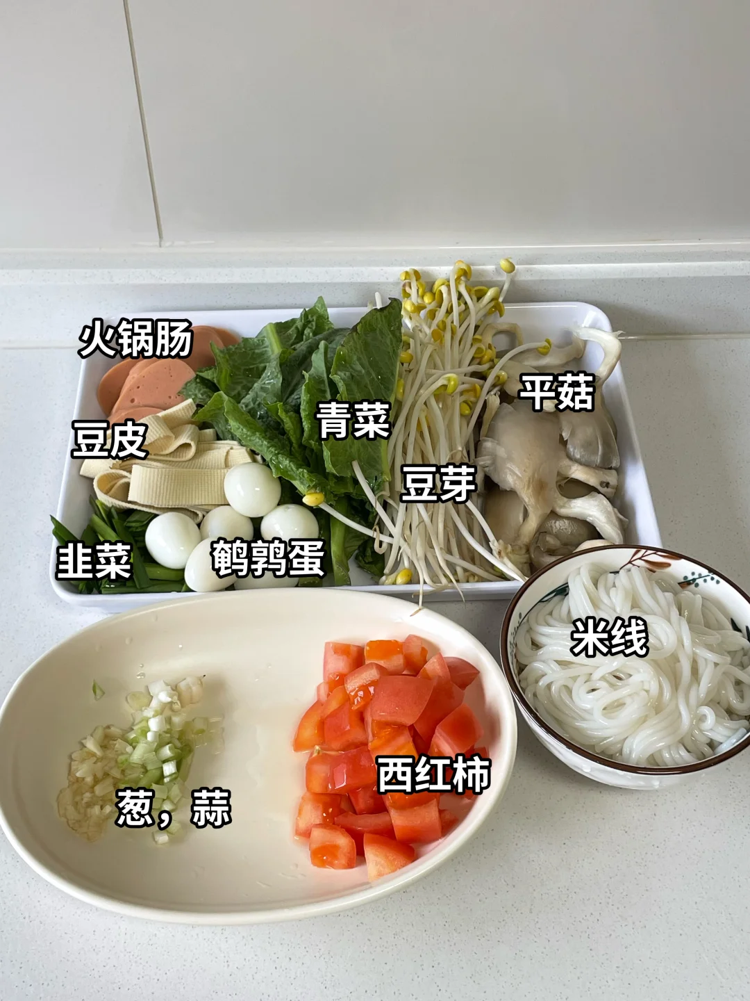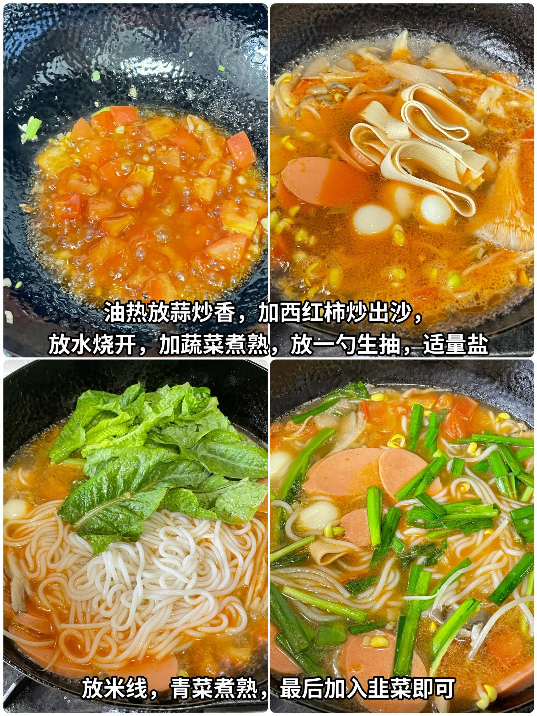 起锅烧油,油热姜蒜和葱炒香,放入西红柿炒出沙,加入水熬开,放入配菜,放入平菇,豆芽,豆皮,鹌鹑蛋,火腿肠煮熟,然后放一勺盐,适量的生抽,进行调味,可以再放一点白胡椒粉和鸡精,然后放入米线和青菜煮熟,加入韭菜段即可