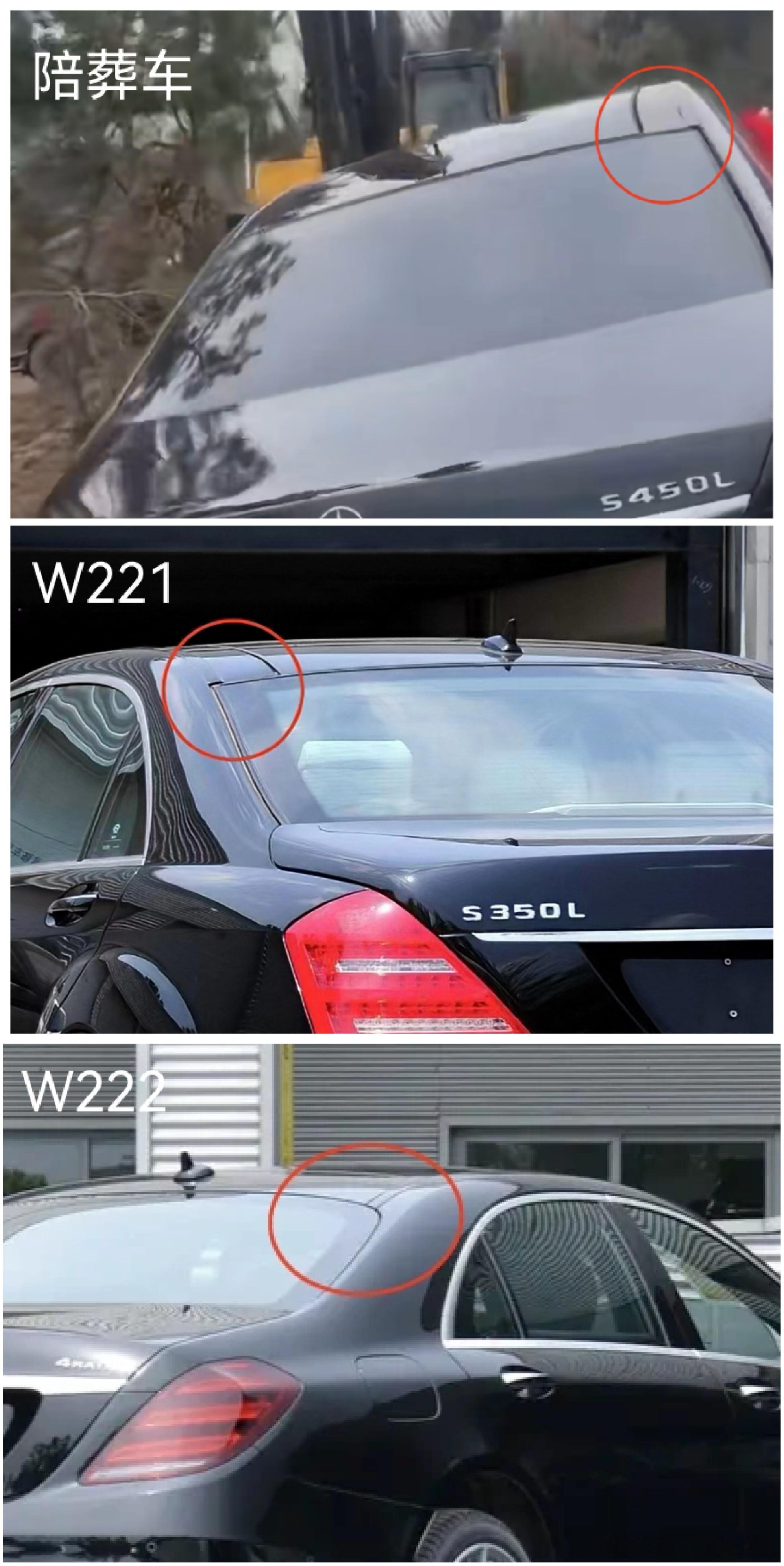 W221是尖角的尾窗,和陪葬车一致,而正品W222是圆角的