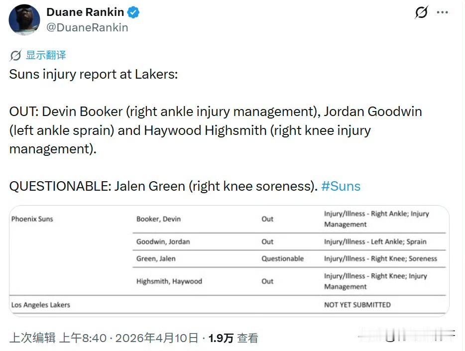 北京时间4月11日上午十点半,湖人坐镇主场迎战太阳队,这是双方的倒数第二场比赛,但是也事关排名,太阳已经确定排名西部第七,附加赛是没跑了,而湖人还在为稳住自己第四的位置努力。