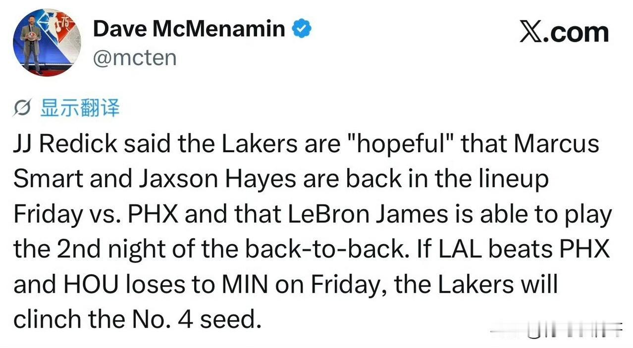 主教练雷迪克表示,湖人队有望在明天的比赛中迎回斯马特和海斯,同时詹姆斯预计也能出战背靠背第二场比赛。