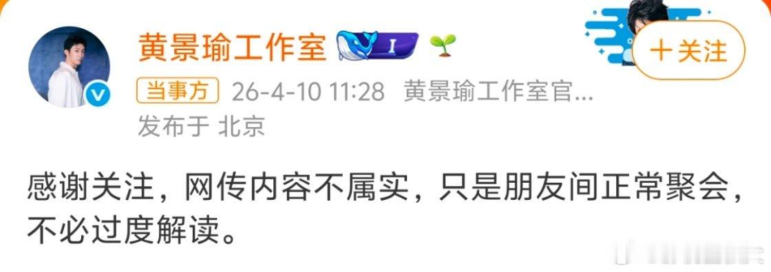 曝黄景瑜王玉雯恋情4月10日有八卦媒体拍到黄景瑜和王玉雯聚餐后,凌晨同乘商务车去酒店,绕路避拍、车库停留后同乘电梯上楼,整夜没离开,次日黄景瑜还再去了该酒店。双方工作室火速辟谣,称只是朋友正常社交,还是希望大家多多关注自己的生活吧,毕竟明星也需要私人空间