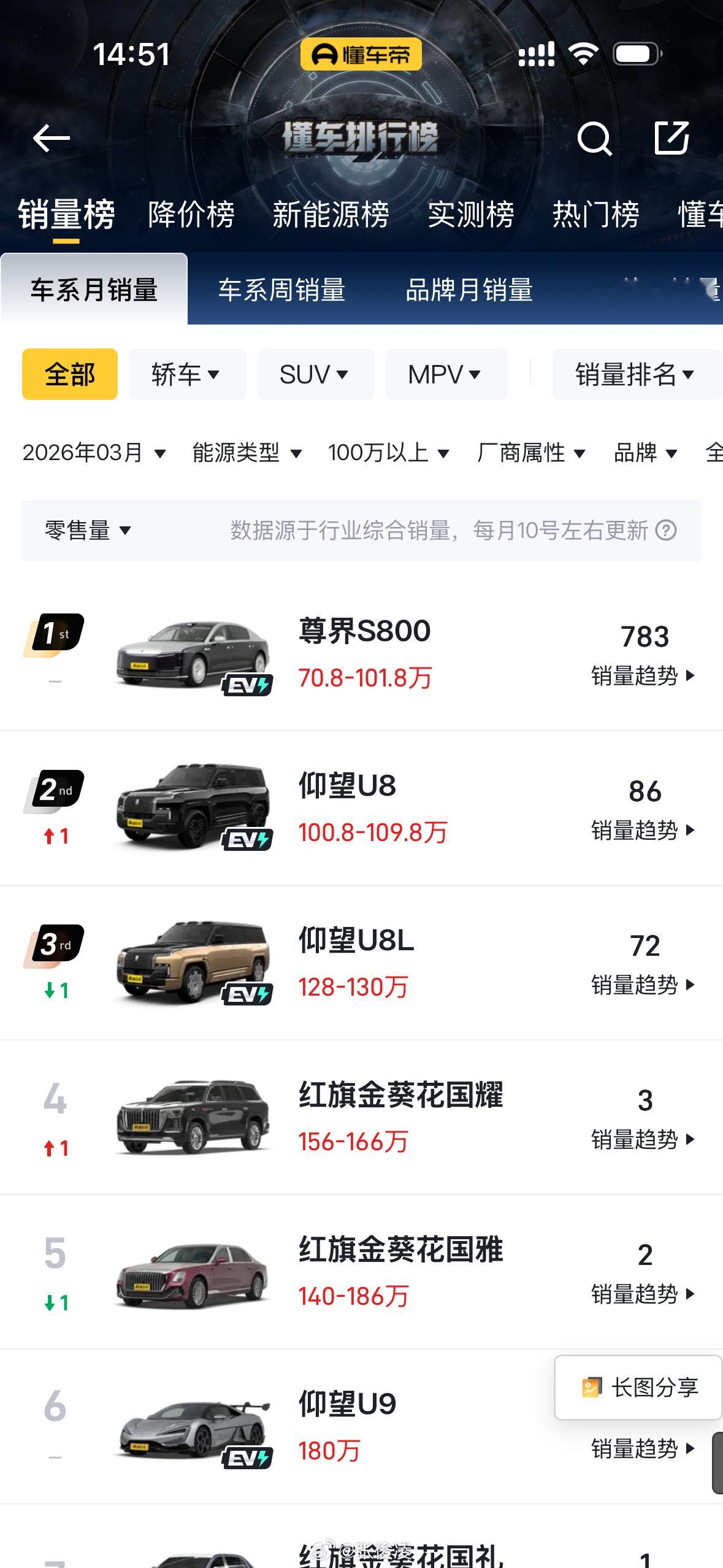 尊界S800登顶3月超豪华轿车榜