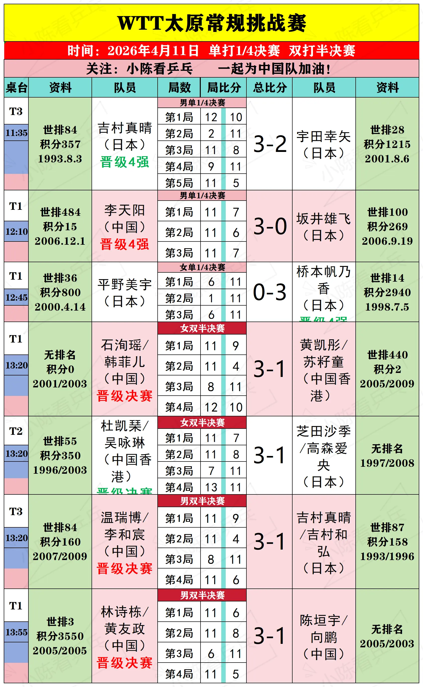 WTT太原常规挑战赛4月11日上半场赛况。WTT太原常规挑战赛4月11日上半场比赛结果,男女单打1/4决赛,女单4强中国队仅石洵瑶晋级,另外三席都是日本队;男单4强中国队占据2席,锁定一个决赛席位;女双中国队石洵瑶/韩菲儿晋级决赛;男双中国队会师决赛,提前锁定冠亚军,中国队继续加油。
