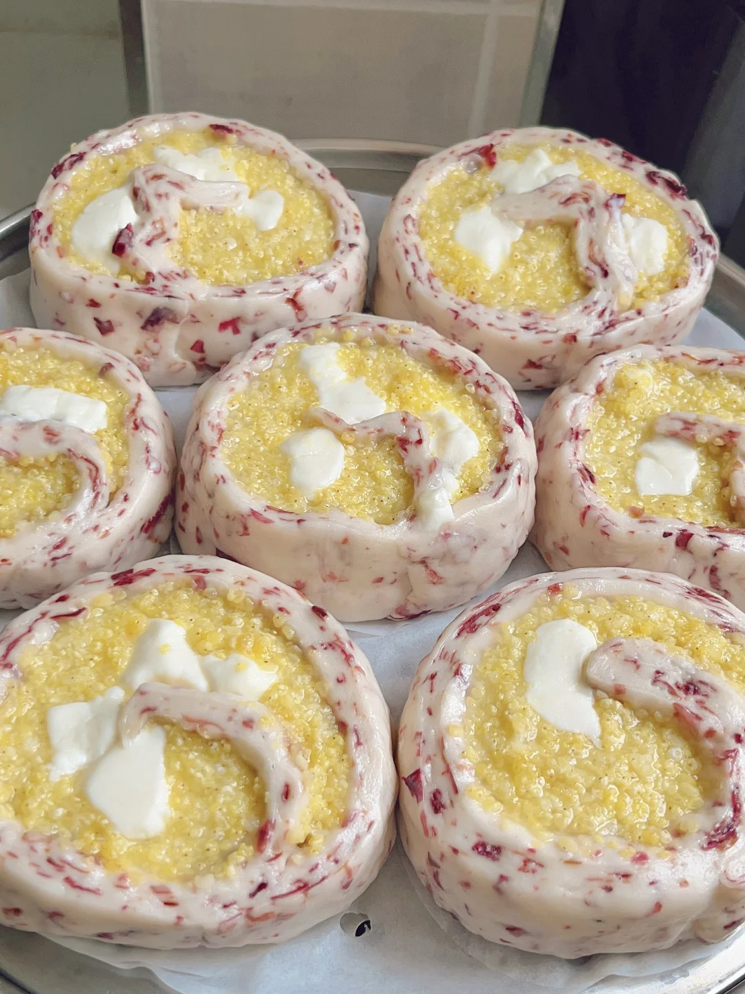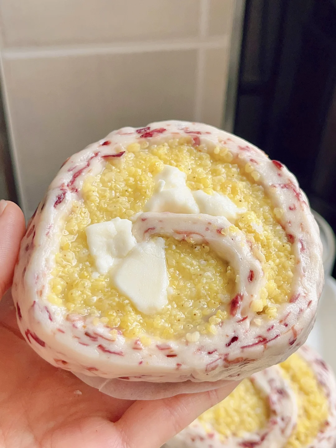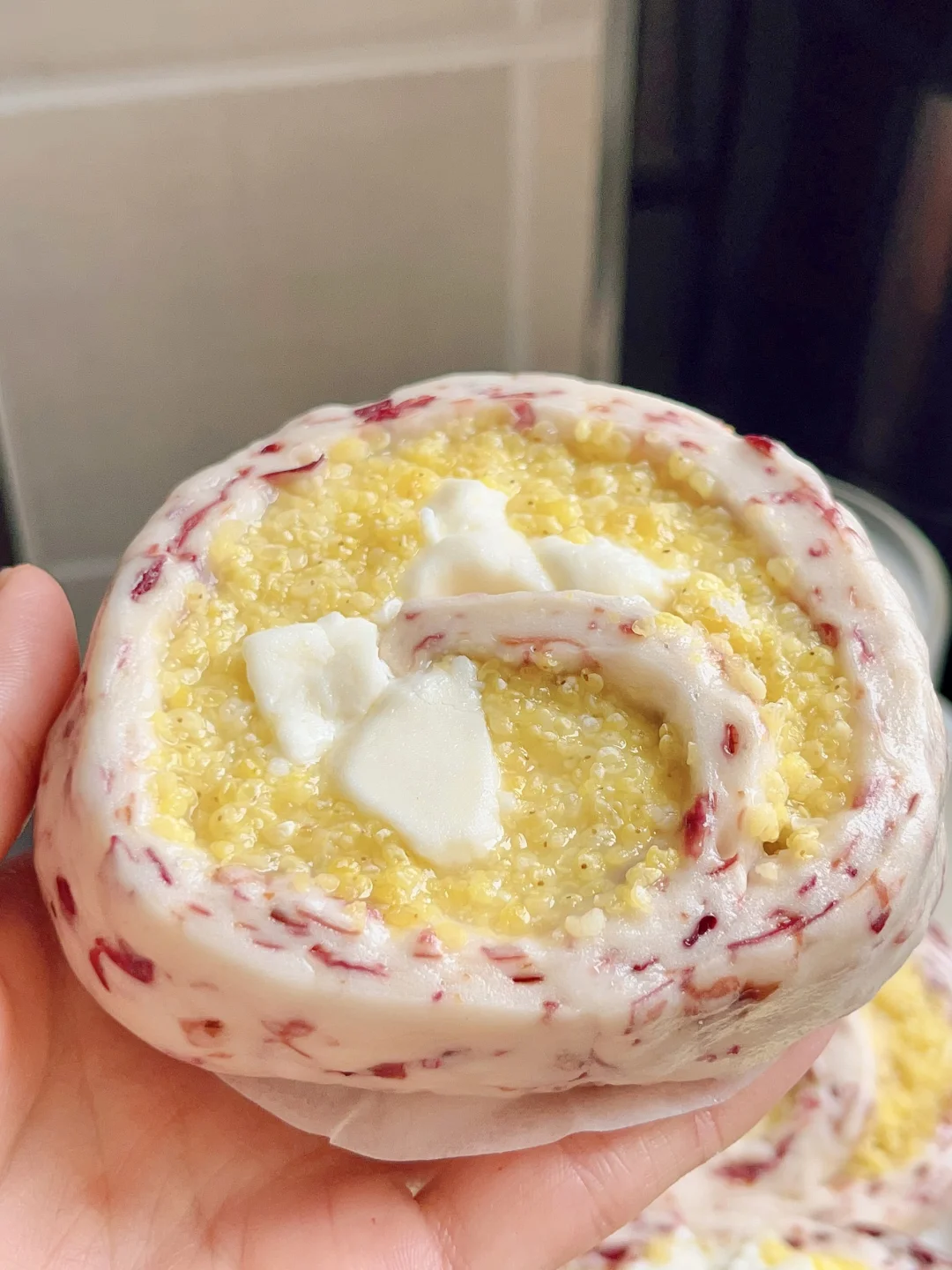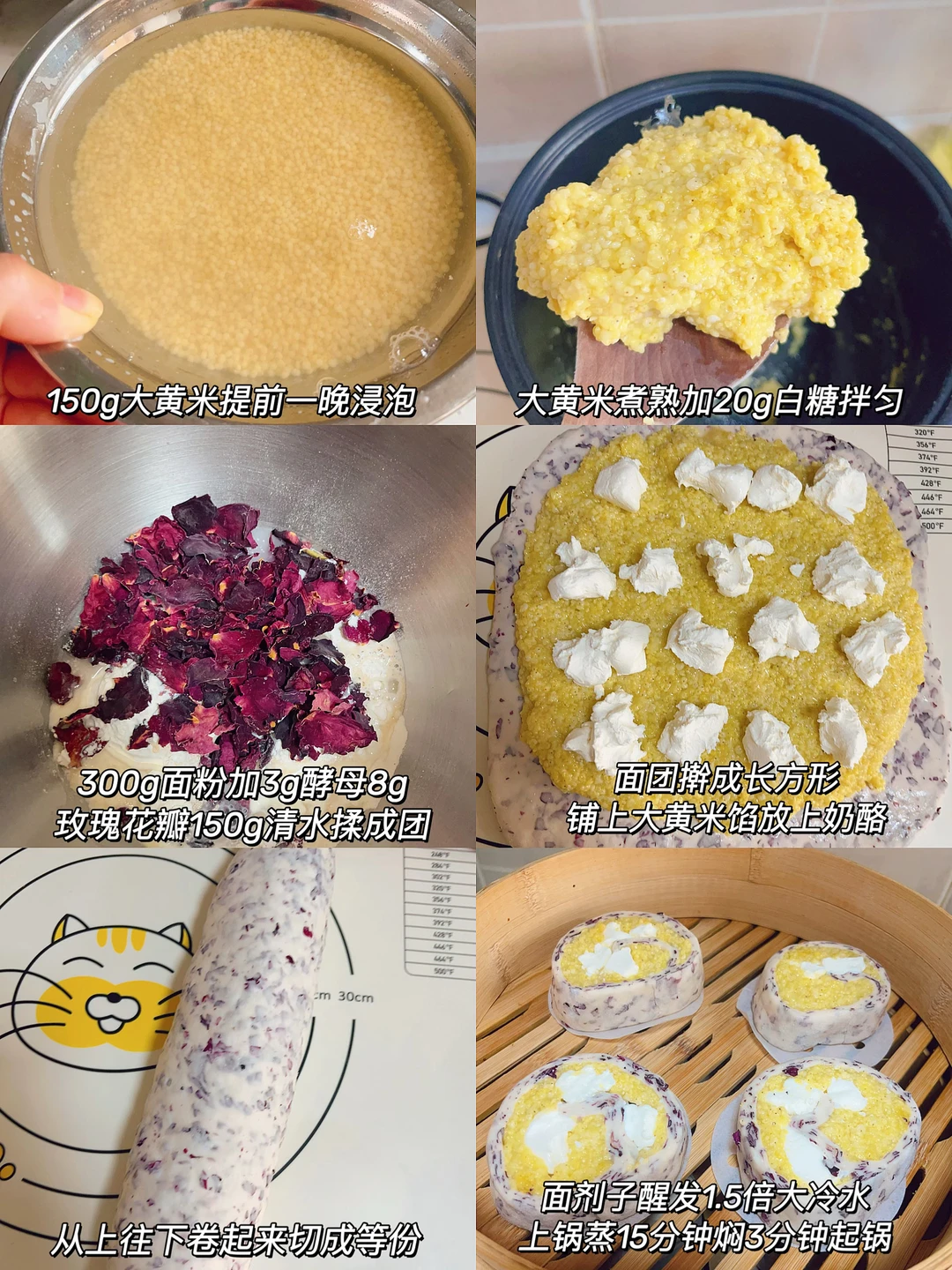 软软糯糯,奶香配着花香注定会让这个玫瑰大黄米奶酪馒头卷不是一般的好吃了