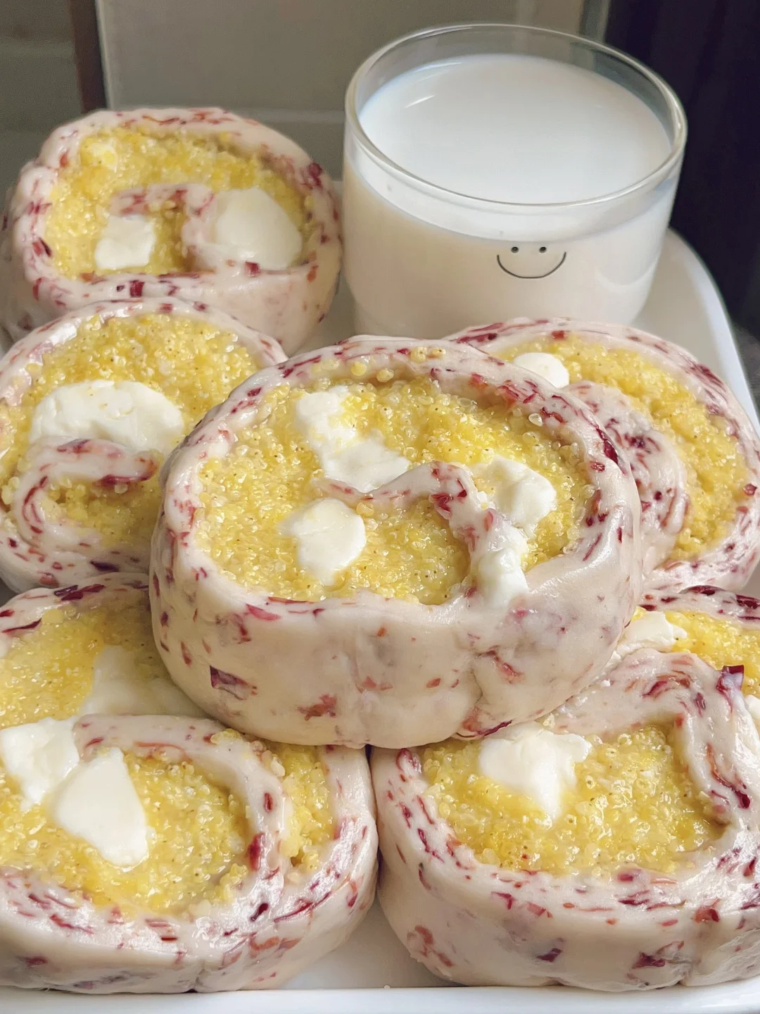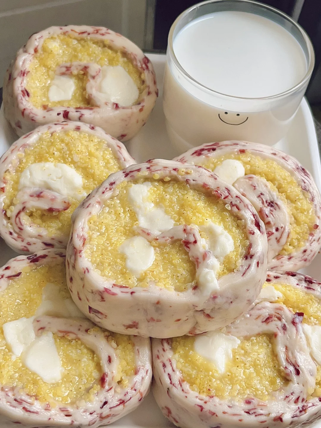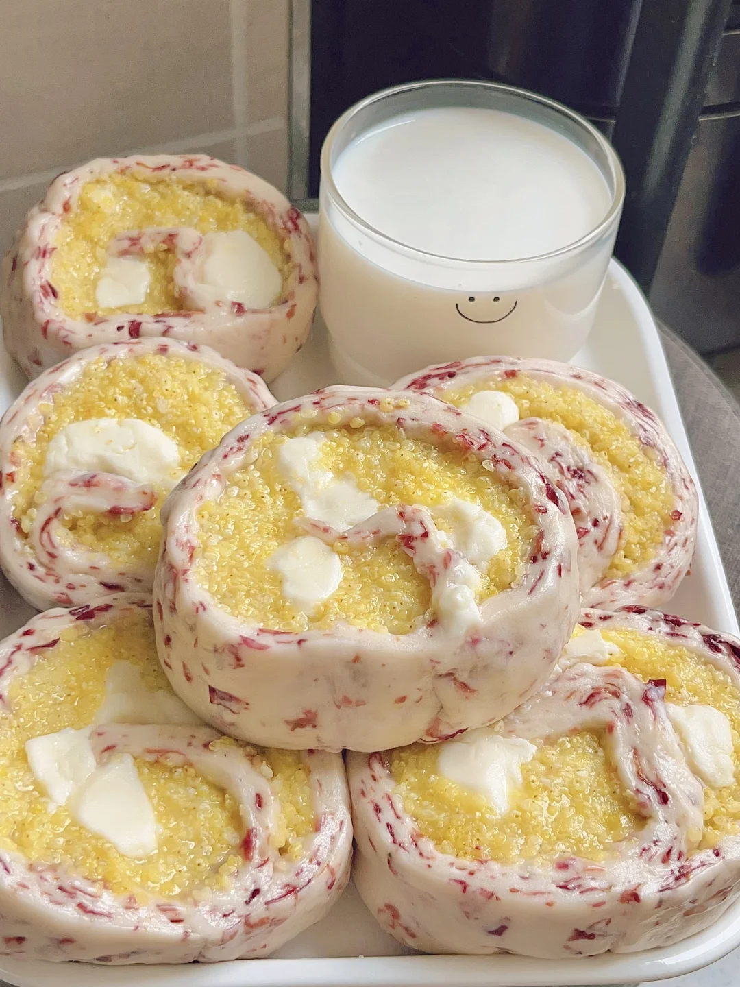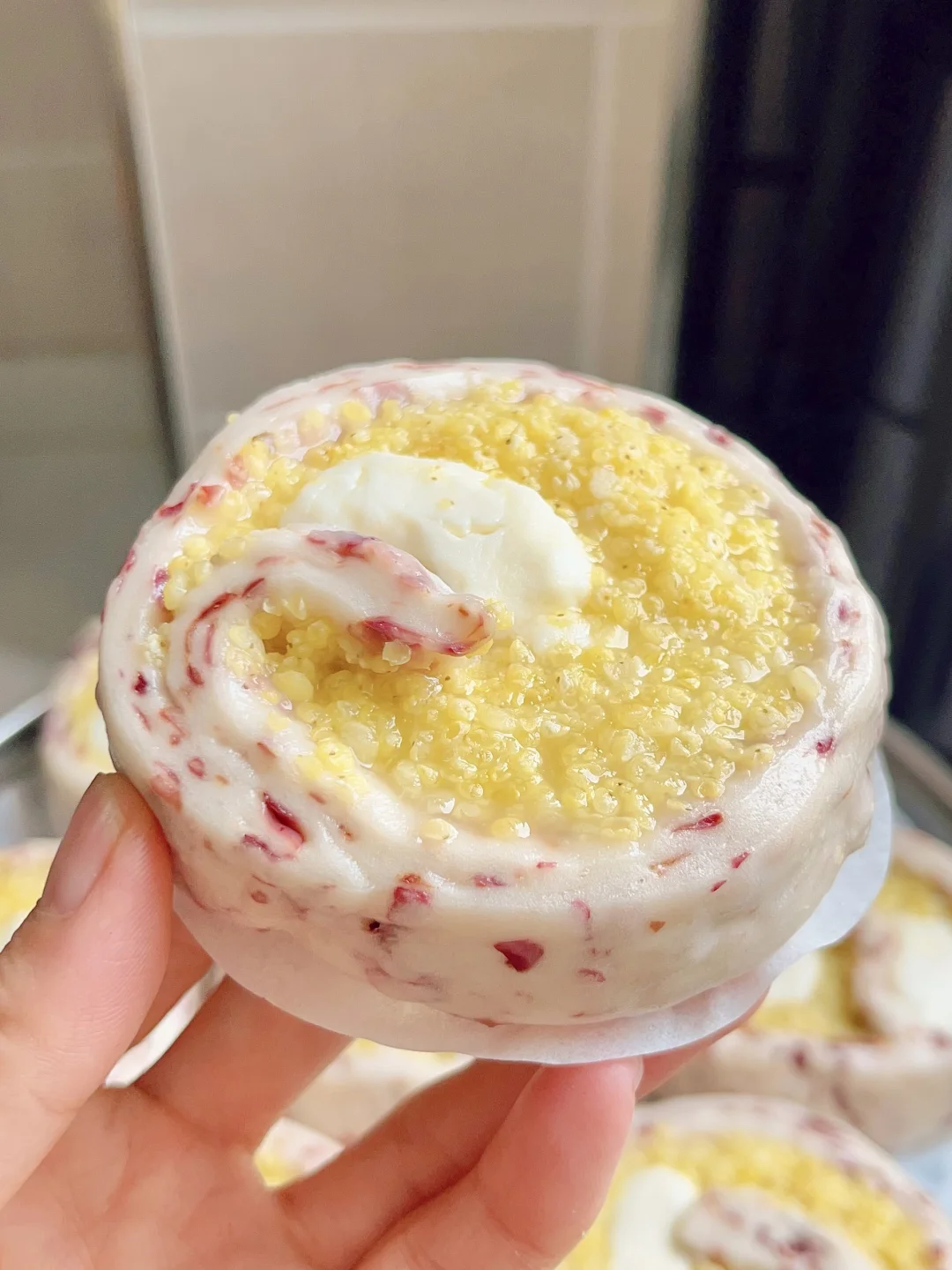 软软糯糯,奶香配着花香注定会让这个玫瑰大黄米奶酪馒头卷不是一般的好吃了