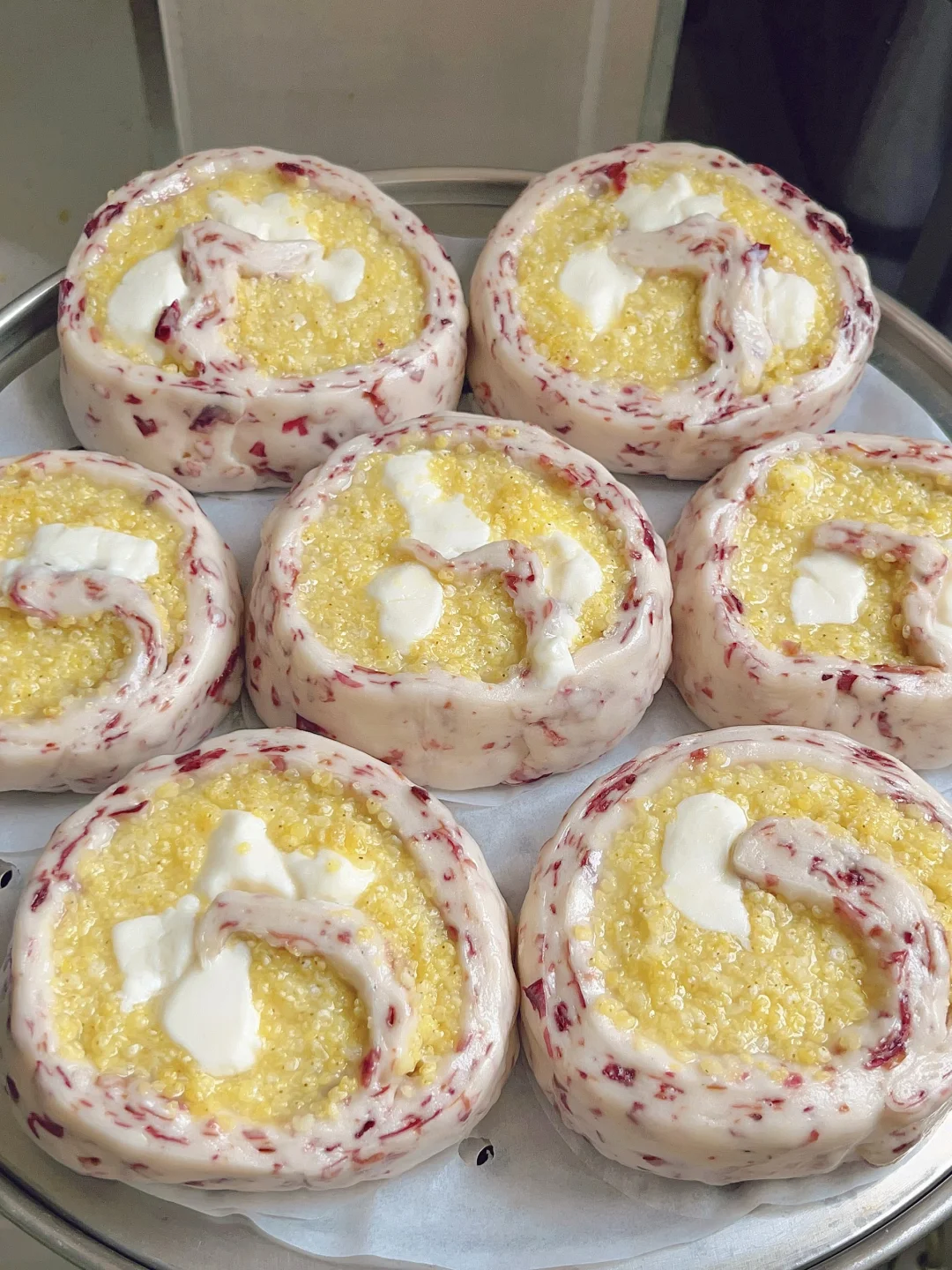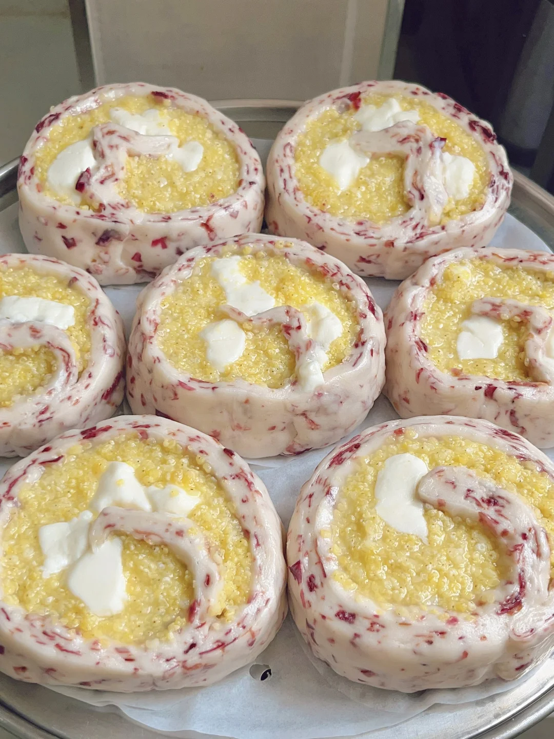 2⃣️面粉加酵母清水玫瑰花瓣揉成面团,面团擀成长方形面片铺上大黄米馅,放上奶酪从上往下卷起来,切成等份