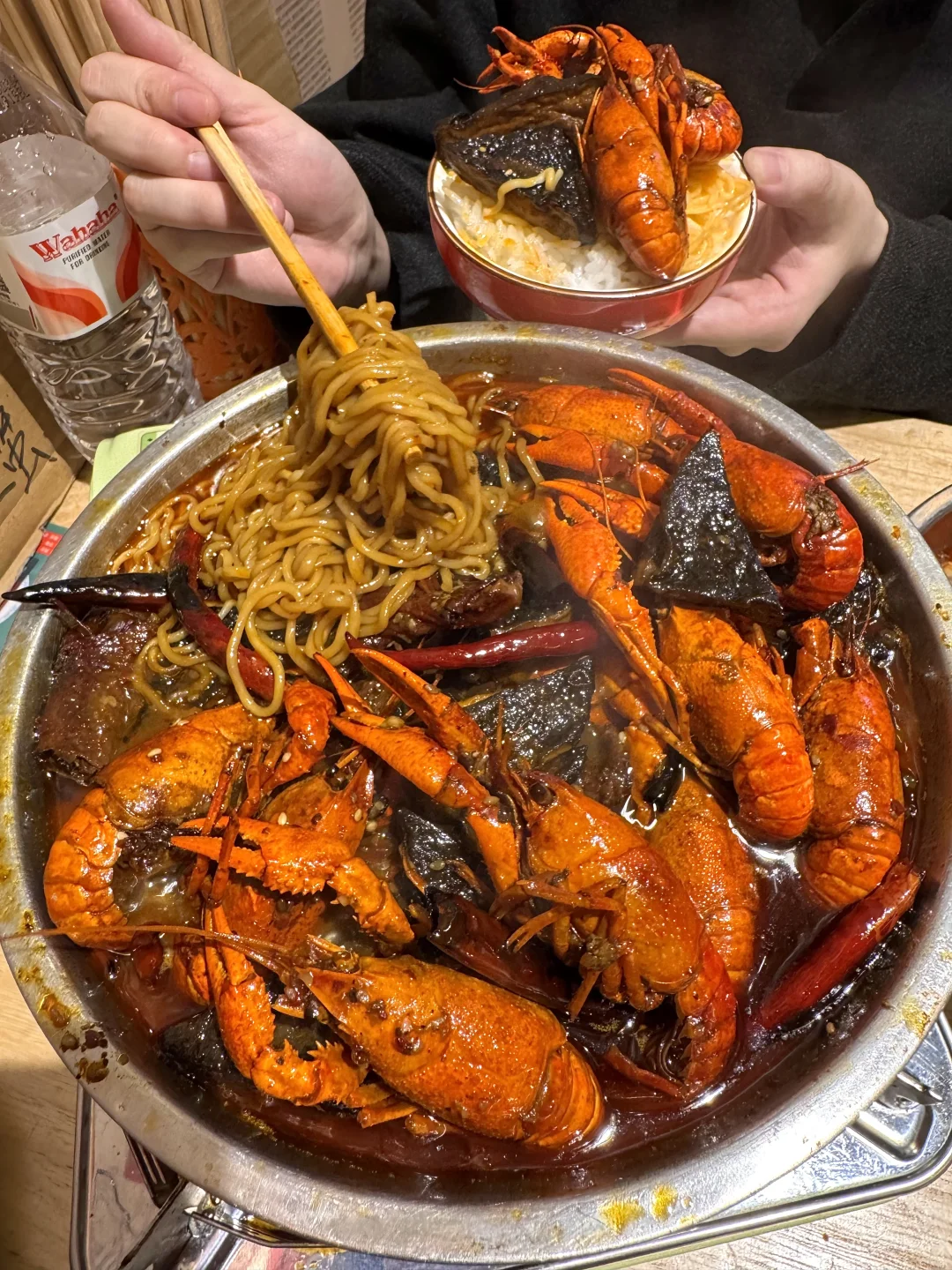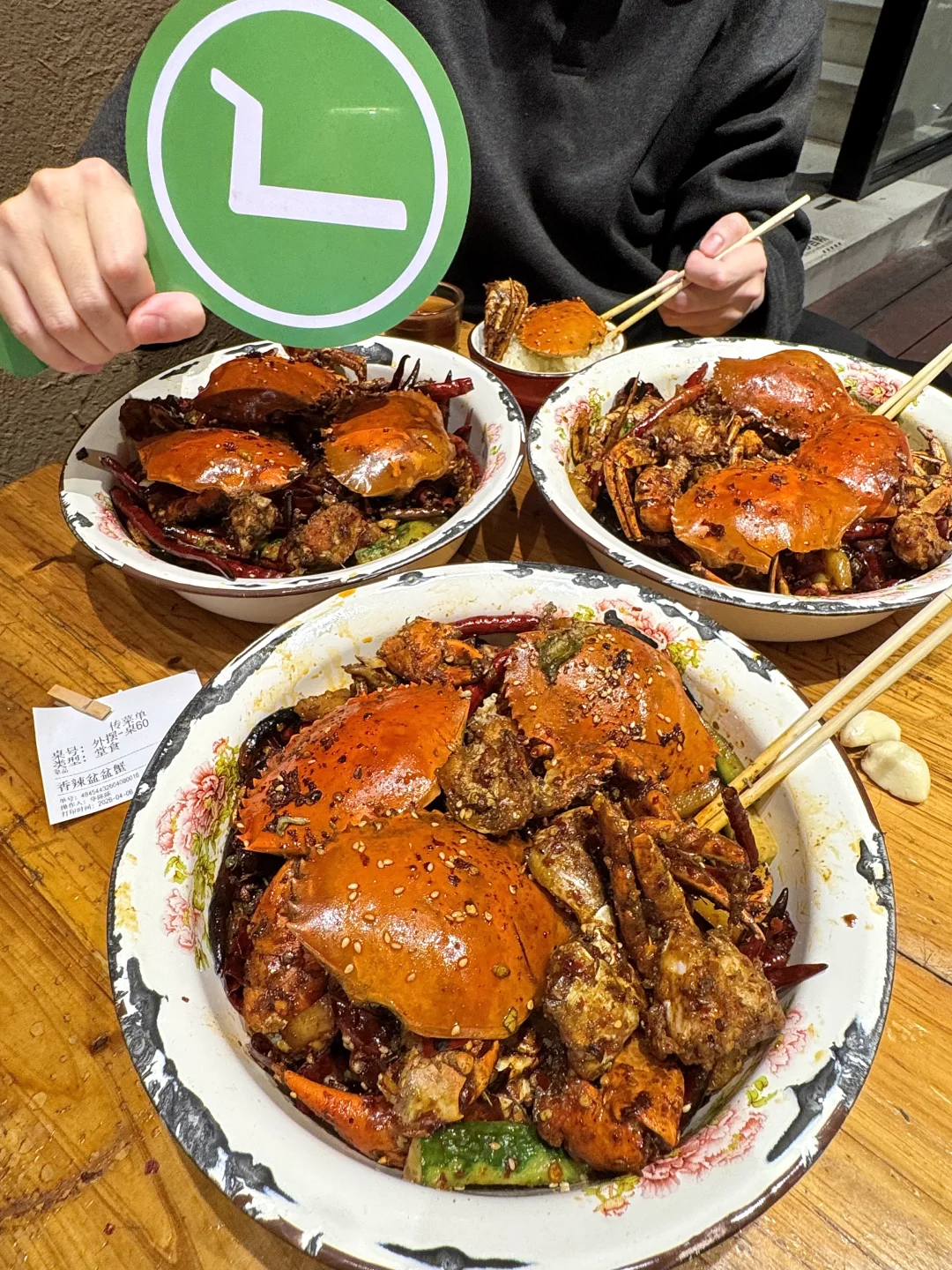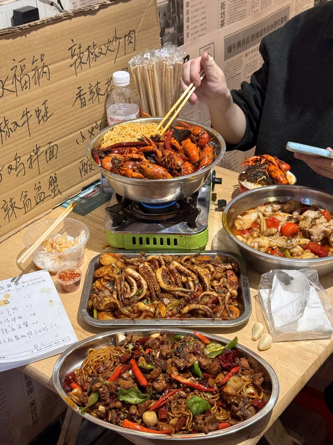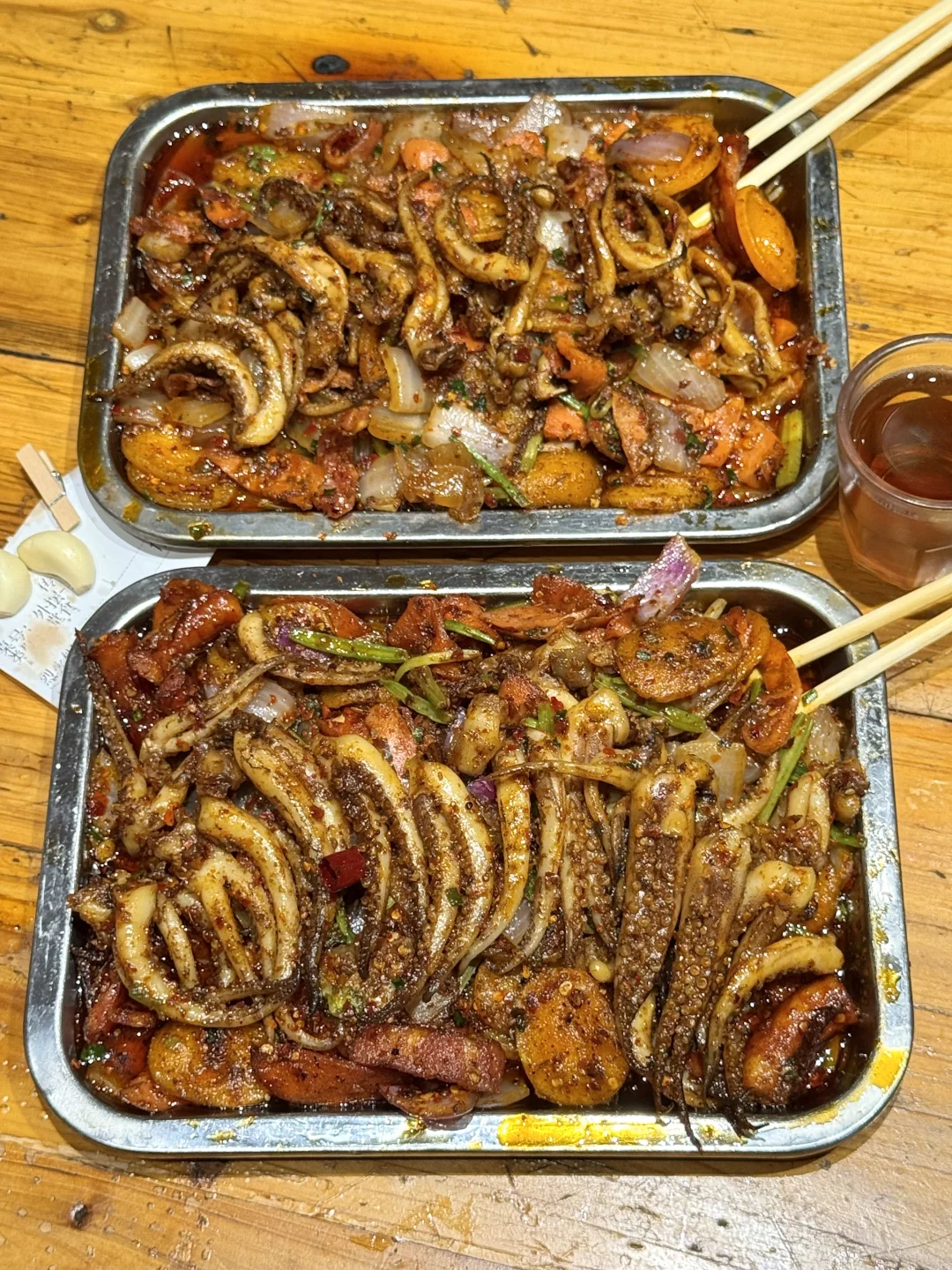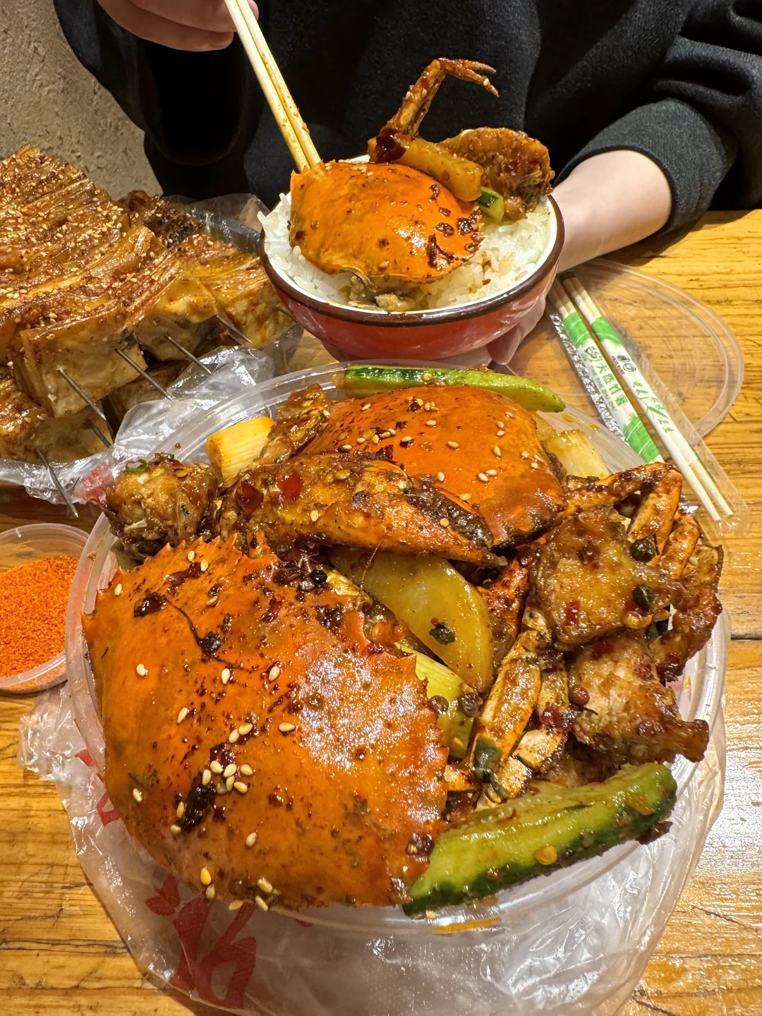 铁板鱿鱼须!鱿鱼裹满酱汁香辣q弹 上桌锅气满满 名不虚传的好吃!!香辣盆盆蟹、臭豆腐小龙虾烧牛蛙、泡椒牛蛙…连下三碗饭!能吃辣的真心推荐啊啊!