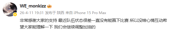 虎扑04月11日讯遭遇四连败后,Monki发文: