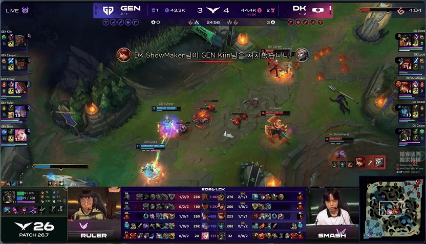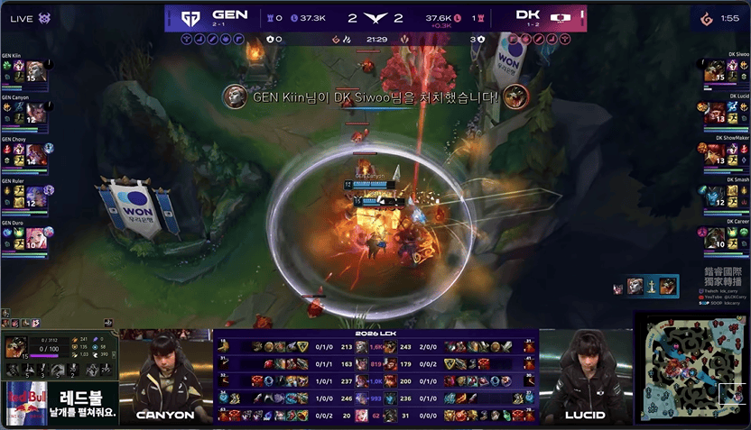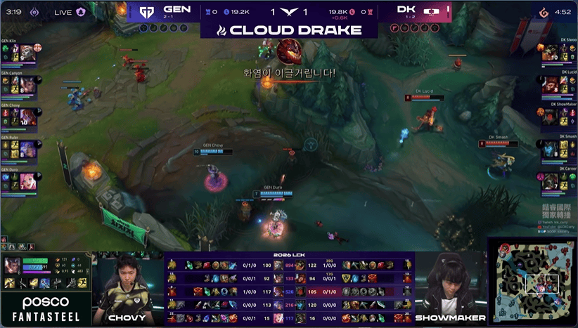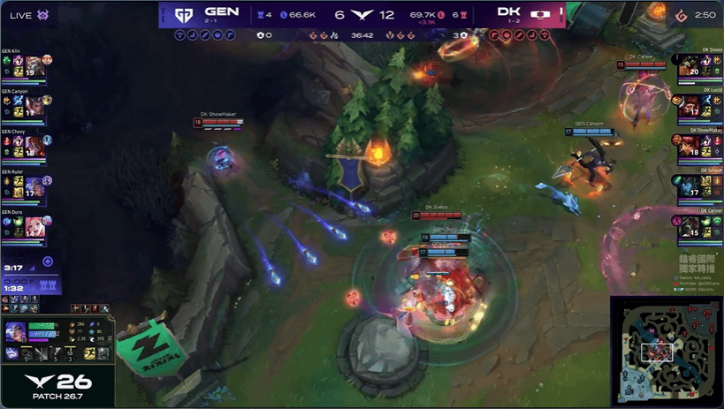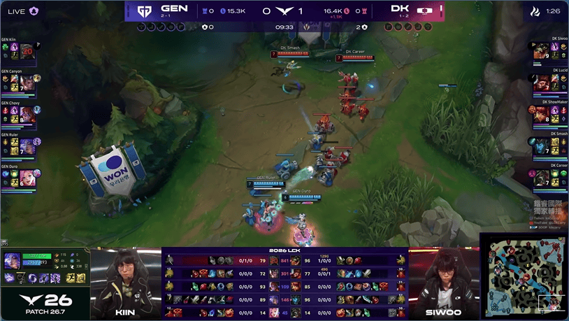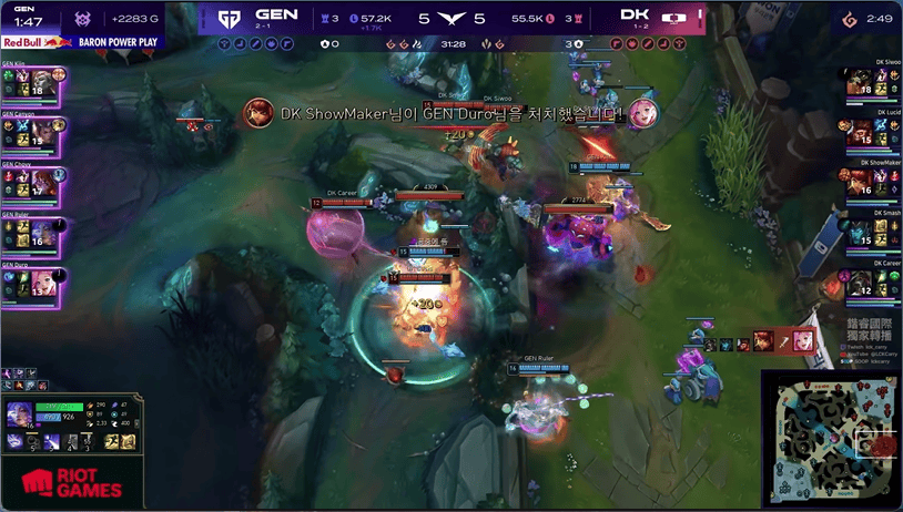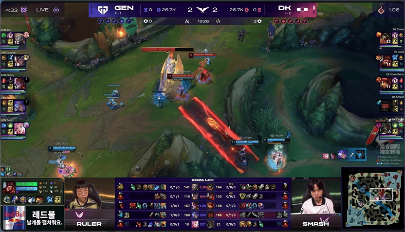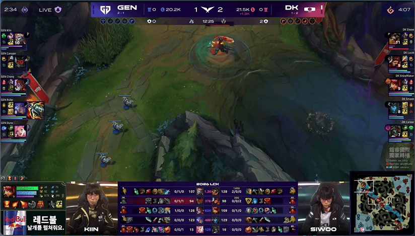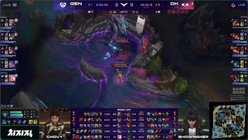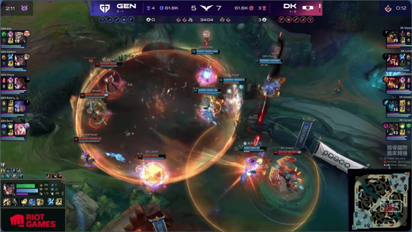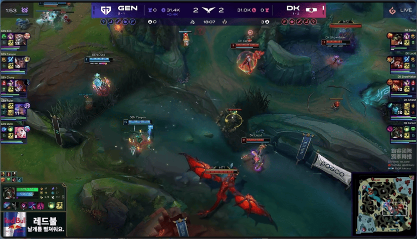 29分钟,DK开打大龙逼团,但被GEN打出0换2,GEN拿下大龙