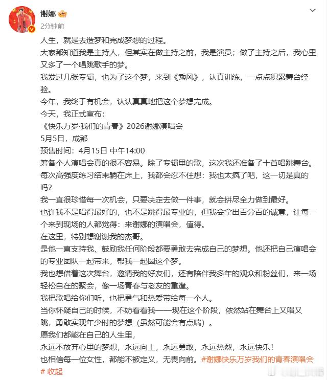 谢娜在浪姐官宣演唱会谢娜在浪姐舞台官宣演唱会啦!五月五号开唱~期待舞台上的活力绽放,坐等开票冲前排