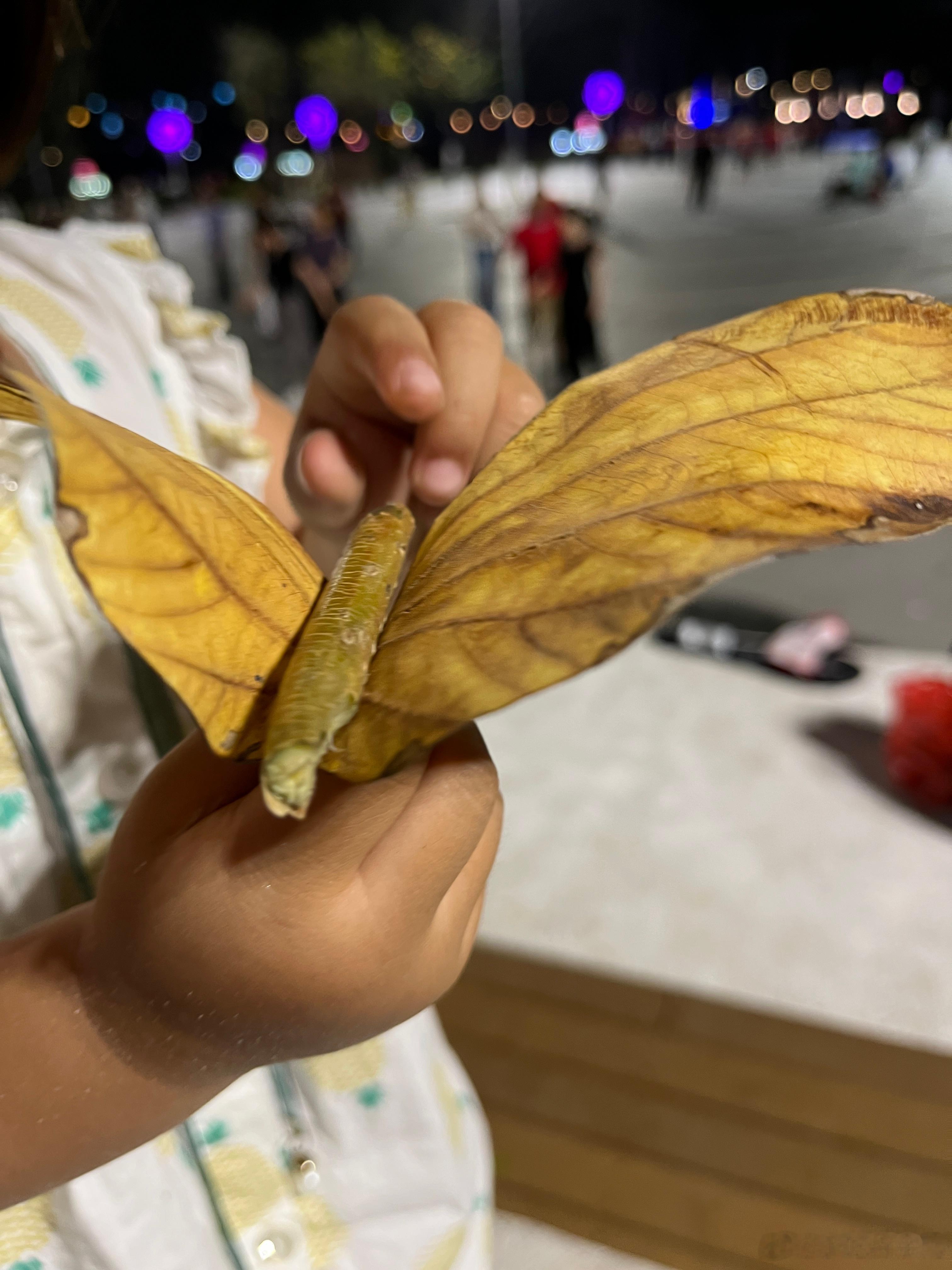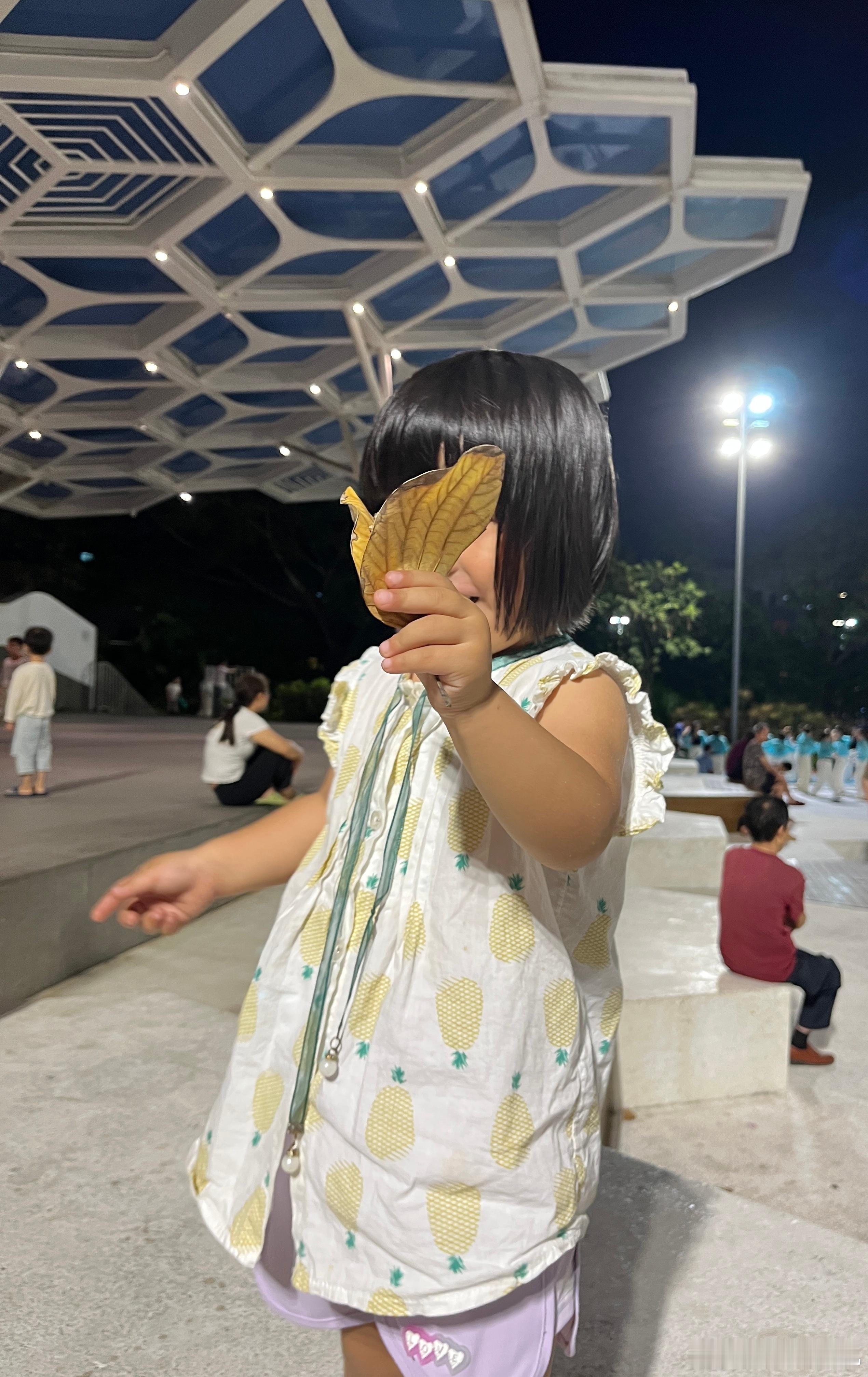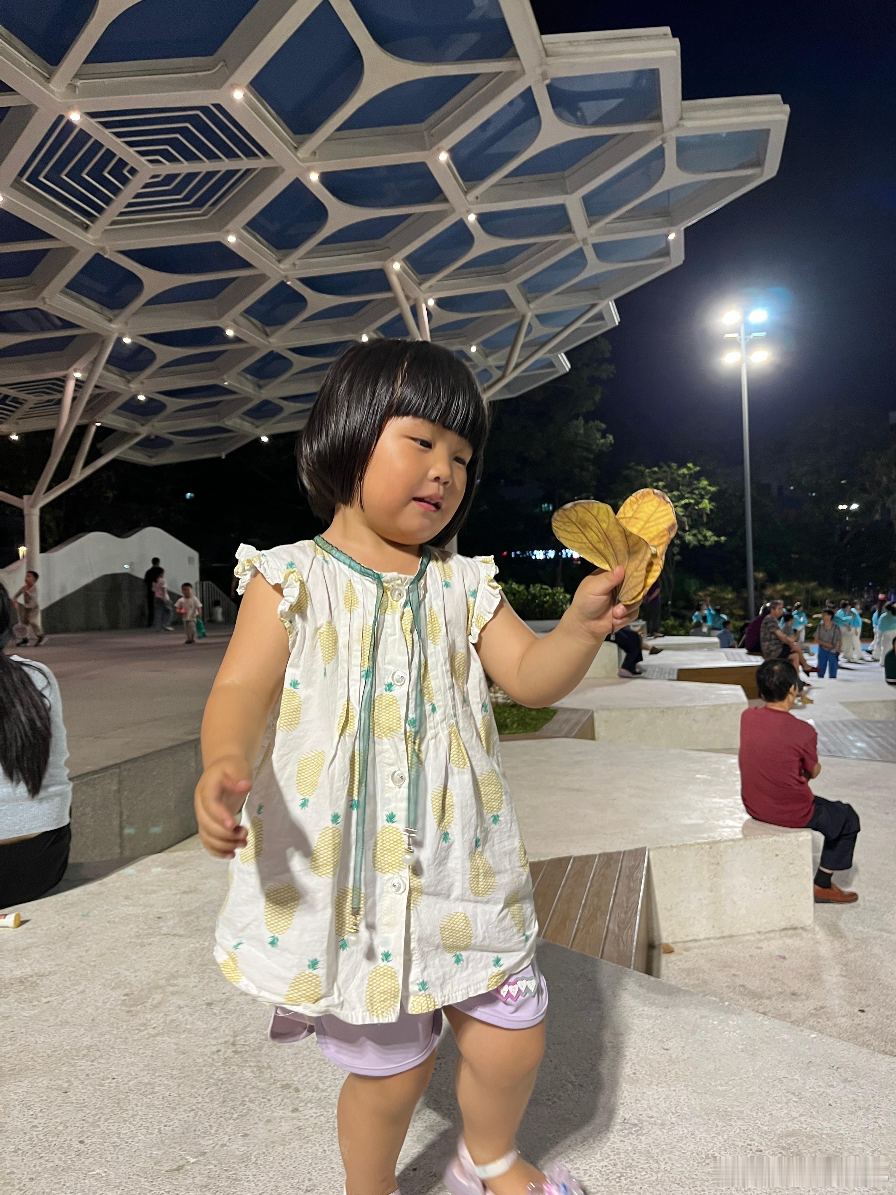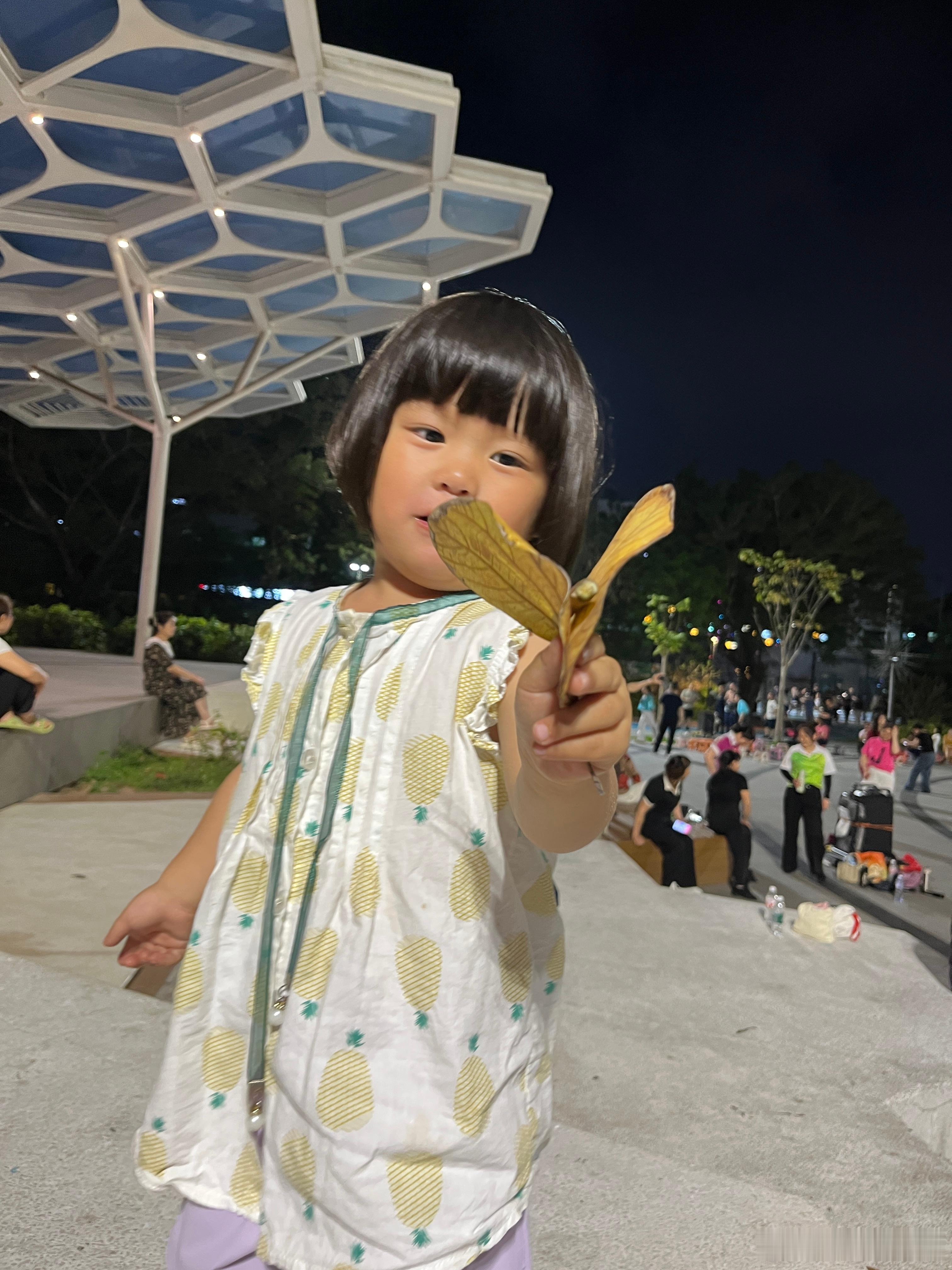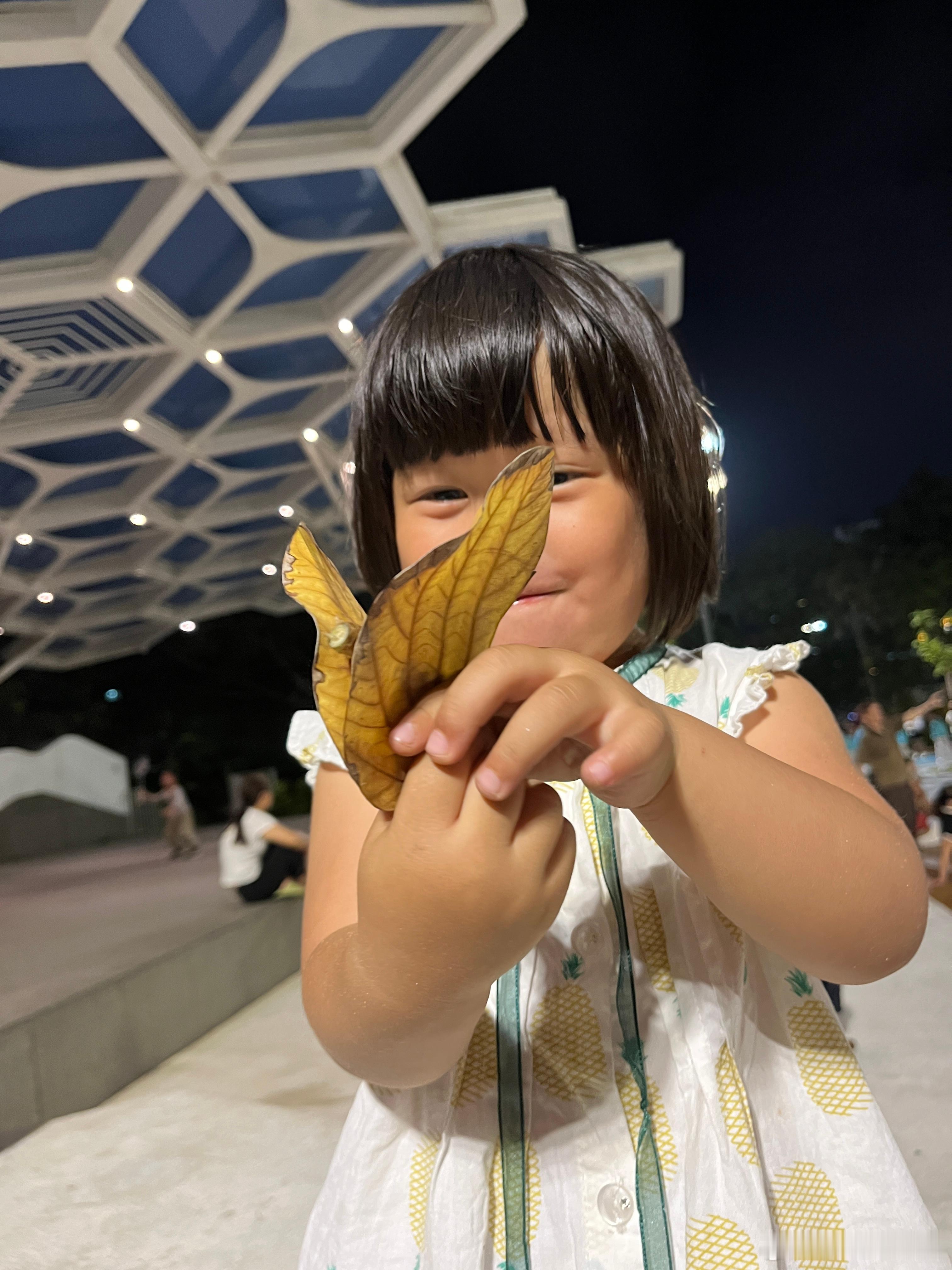 玩到不肯回家,捡了两片叶子,还有一个棍子,做一个花蝴蝶,开心得眼睛眯起来谢娜直播