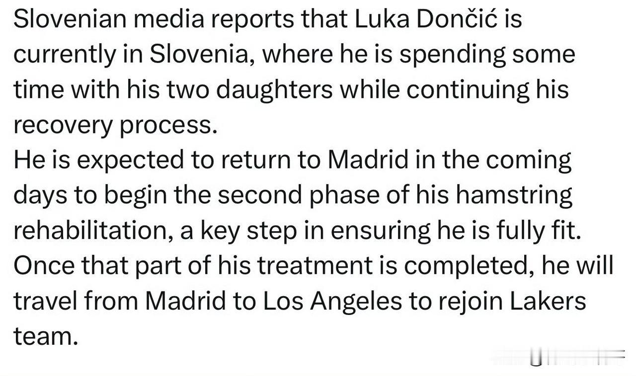 根据斯洛文尼亚媒体最新消息透露,湖人球星卢卡-东契奇目前正在斯洛文尼亚与他的两个女儿共度亲子时光,同时也会继续他的康复过程。