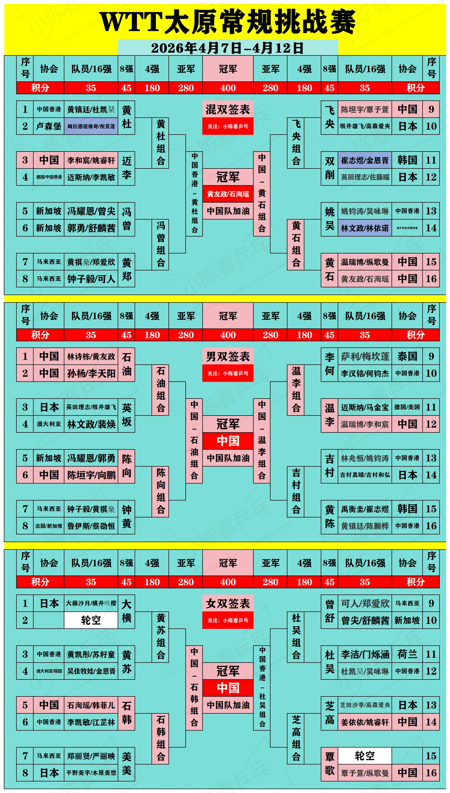 WTT太原常规挑战赛签位图更新4月11日。WTT太原常规挑战赛签位图更新4月11日,男女单打、双打决赛席位出炉,混双冠亚军出炉,混双冠军中国队黄友政/石洵瑶,混双亚军中国香港队黄镇廷/杜凯琹,中国队继续加油。