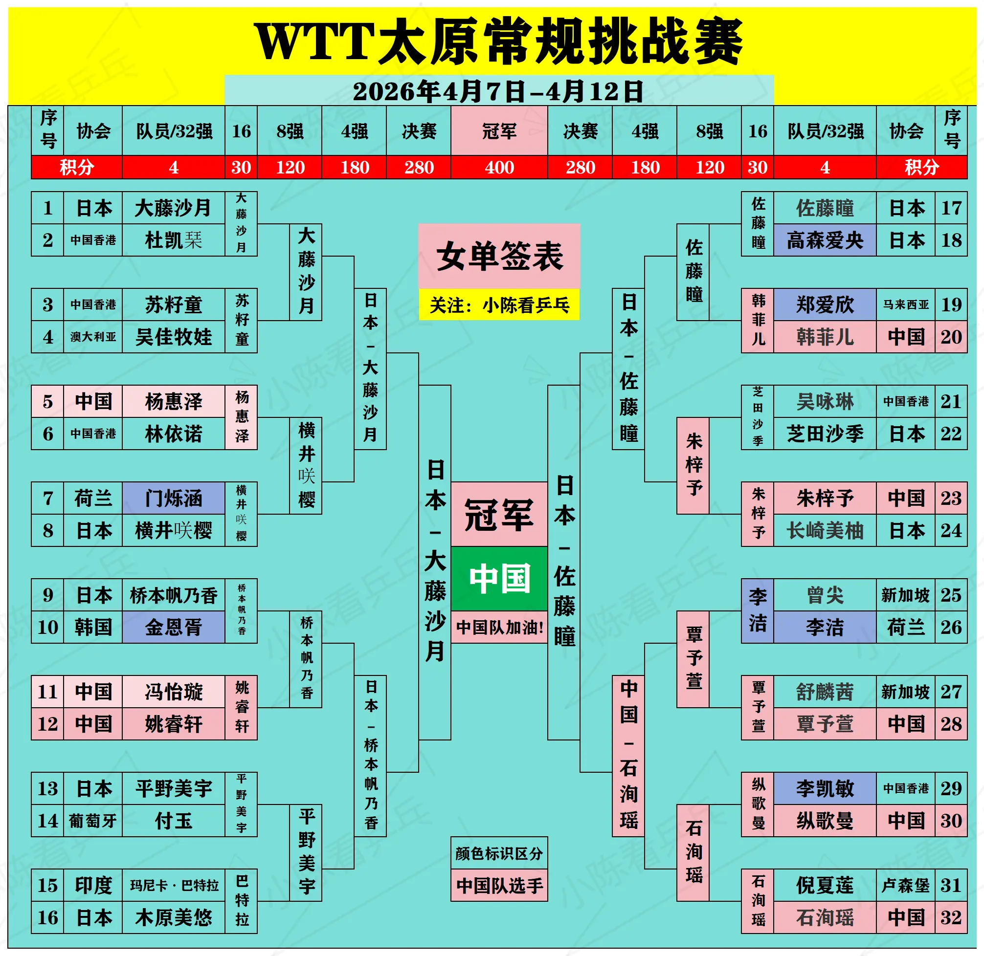 WTT太原常规挑战赛签位图更新4月11日。WTT太原常规挑战赛签位图更...