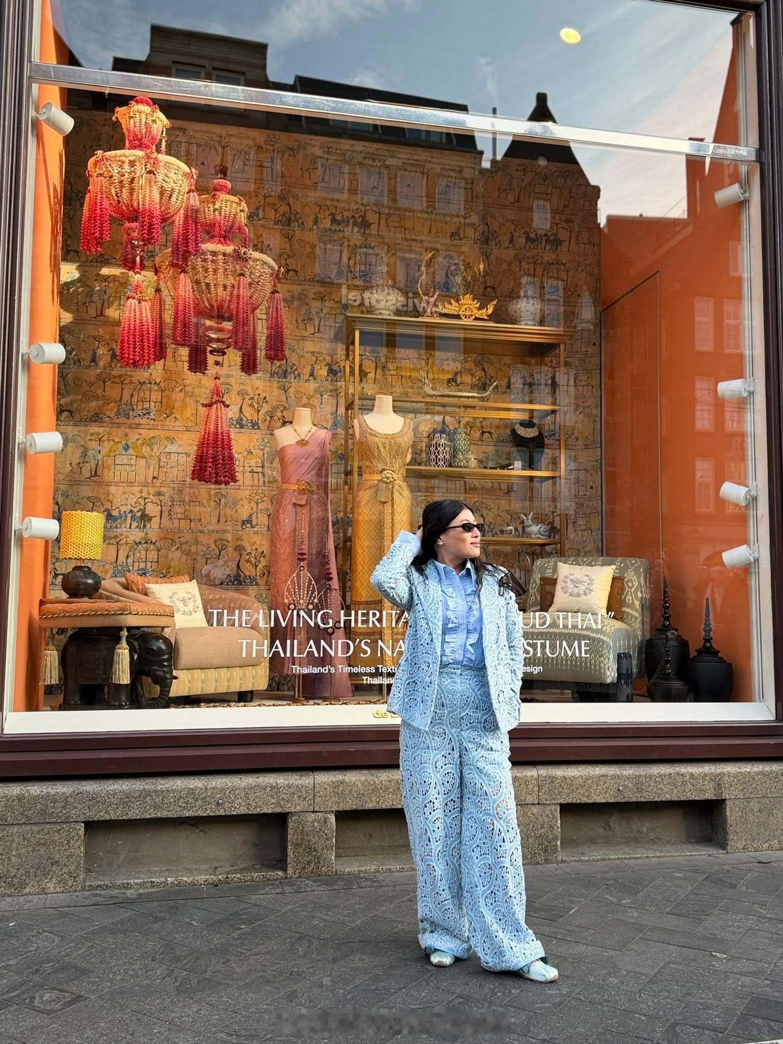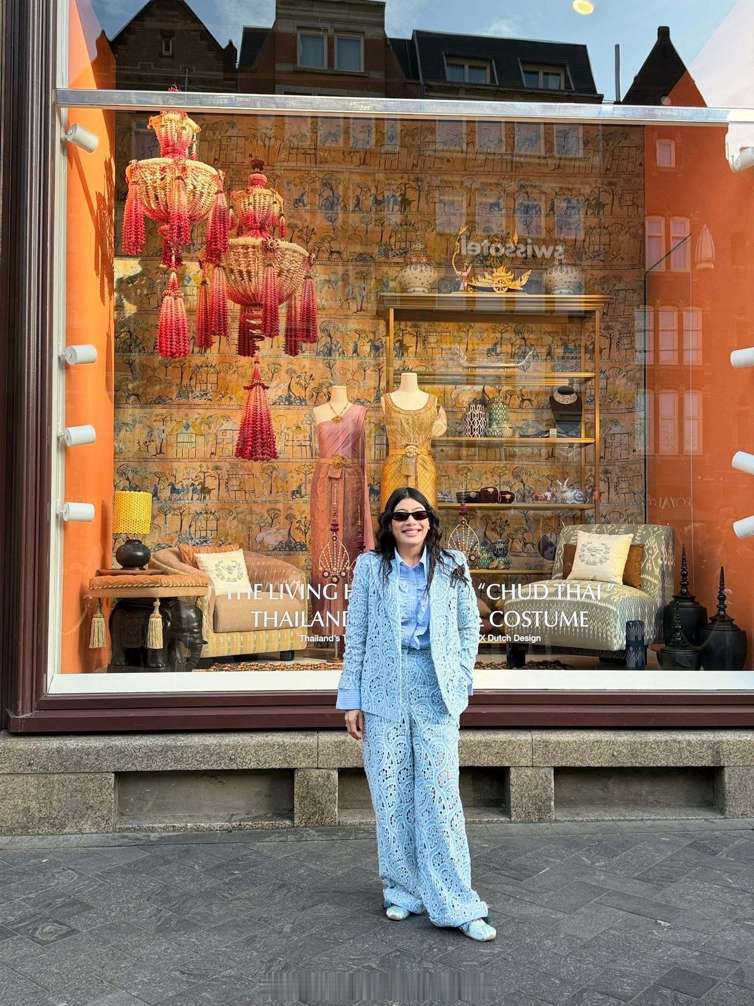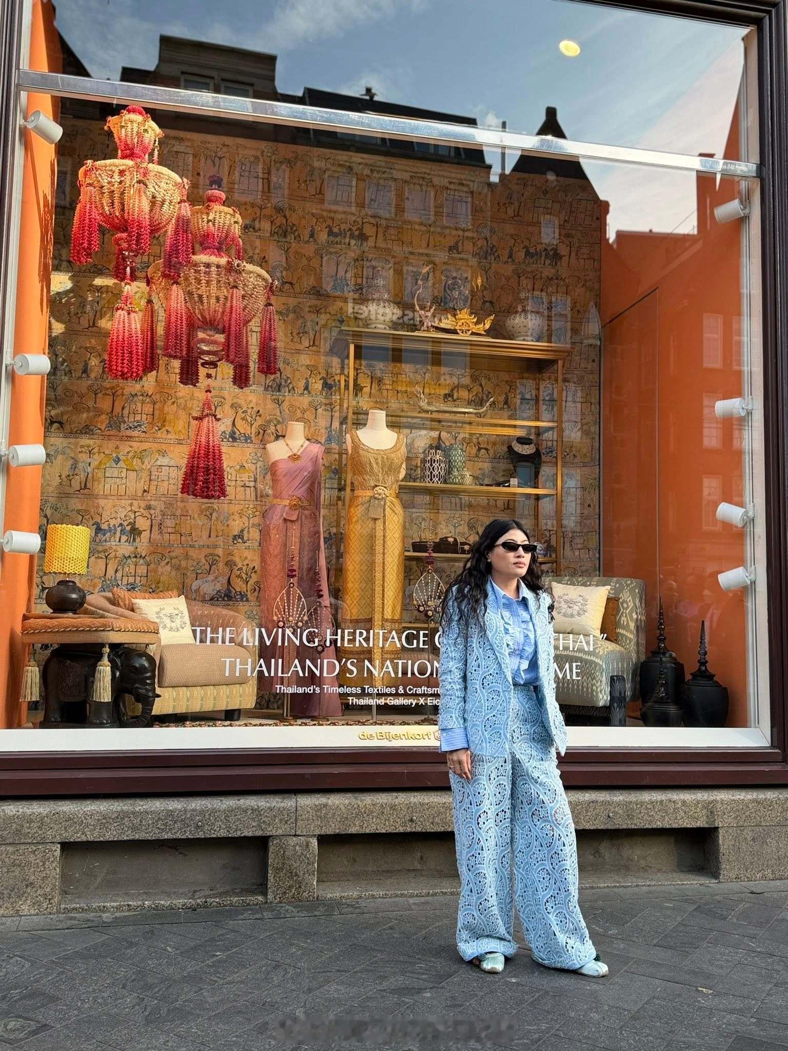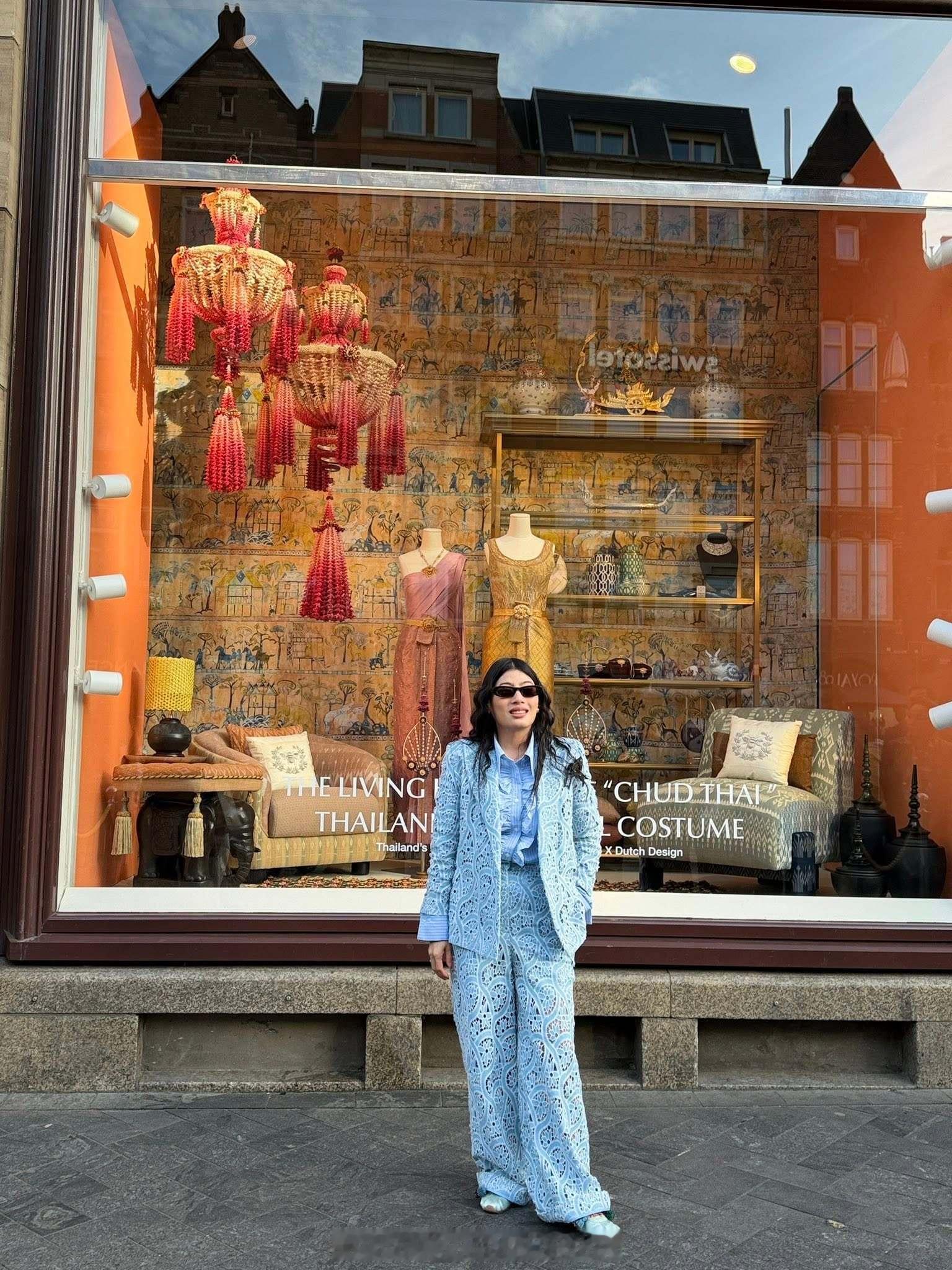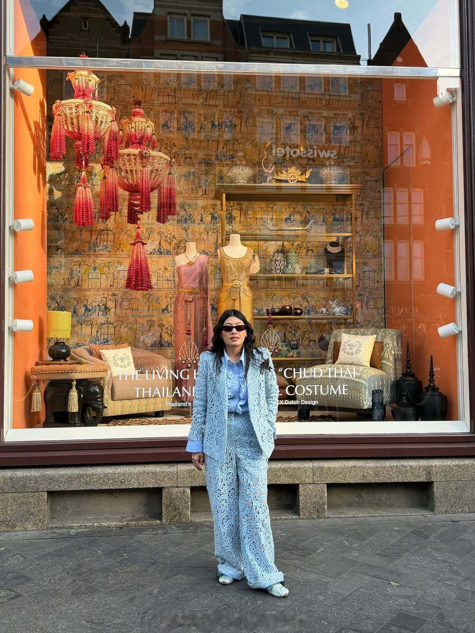 王室王室泰国王室镇宅 镇宅在百货公司窗口的摆拍,背后的橱窗里是她这次带去荷兰的泰丝服饰展品。