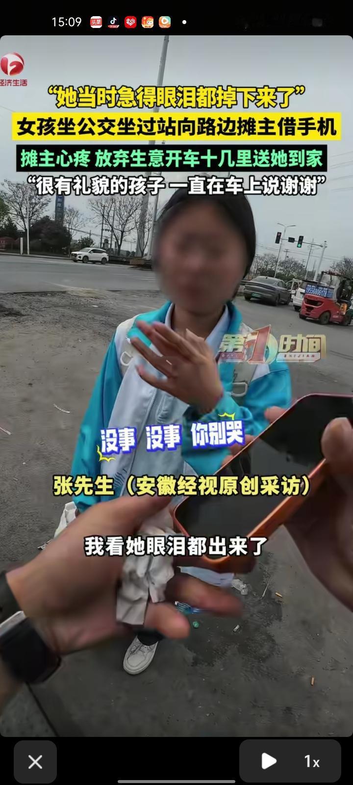 4月11日,安徽阜阳。网友发视频称,自己准备收摊时,发现有位女孩站在那,可能是遇到困难了。问后得知,她是坐公交坐过站,没带手机就来借手机的,给她爸爸打电话后,她爸爸不在家。看女孩眼泪流出来了,就开车十几里送她回家。女孩很有礼貌,一直在车上说谢谢