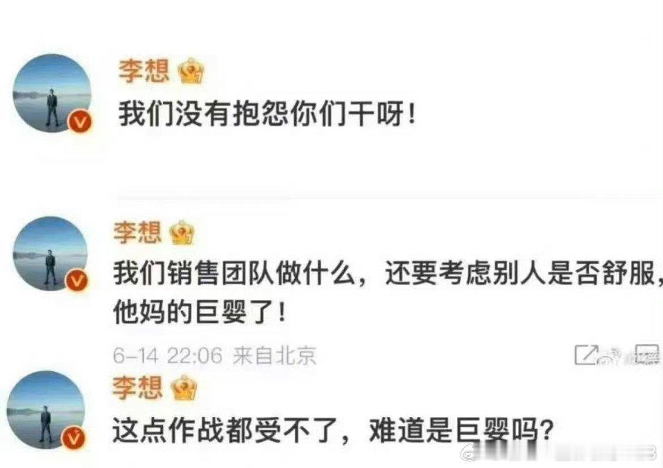 这事儿谁也别说谁更高贵,更清白,本质上...算是内忧外患叠加之下,压力集中爆发的一个缩影东风日产高管回应理想汽车李想朋友圈飙脏话理想汽车就被拉踩对比报案