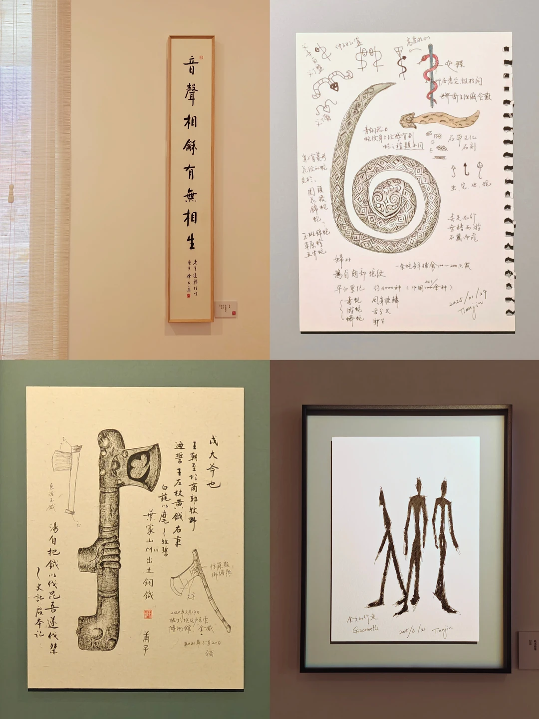 🔍其中蕞精彩的部分,是笔记中那些天马行空又极其敏锐的视觉联想。他把商代金文的字形动态和贾科梅蒂的雕塑并置,从大汶口彩陶的纹样里看出了巴斯奎特涂鸦的神韵,这不是随意发散,而是基于深厚学养的形式敏感,是真正意义上的跨文明视觉谱系建构,堪称一场跨越时空的“视觉狂想”。